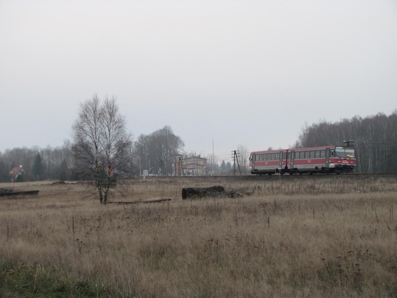 Szynobus ze Szczecinka do Słupska zbliża się do południowej głowicy nieczynnej mijanki.