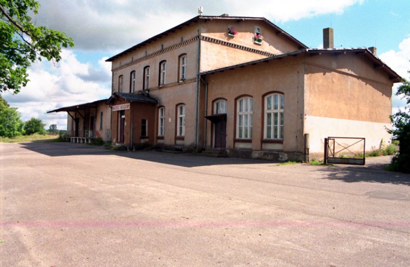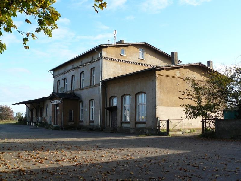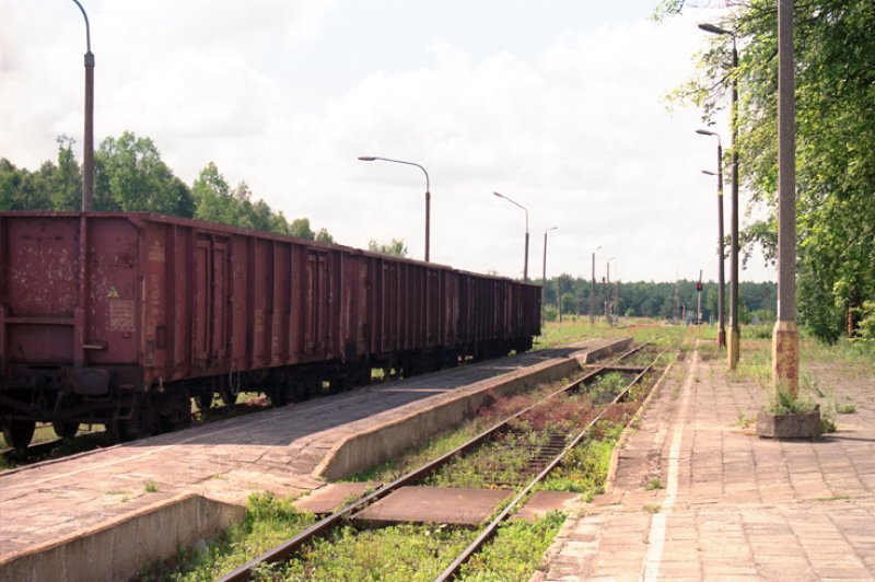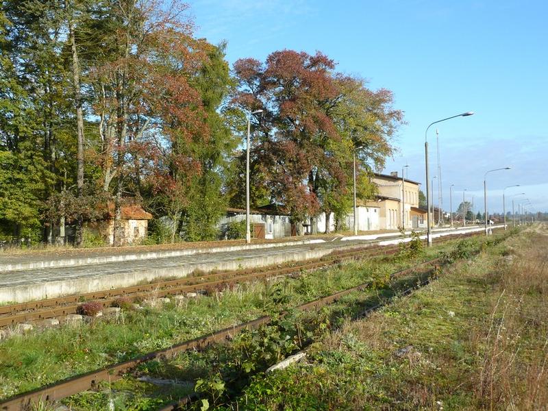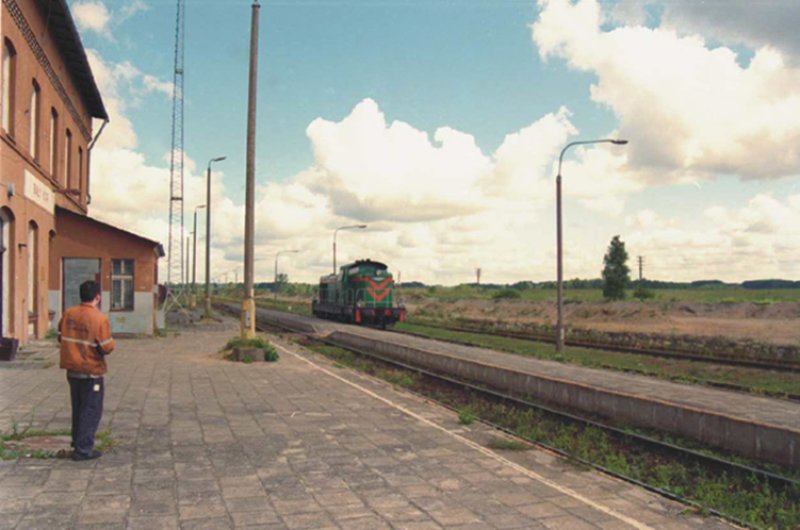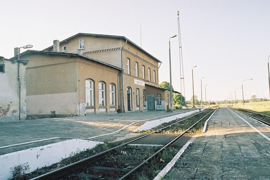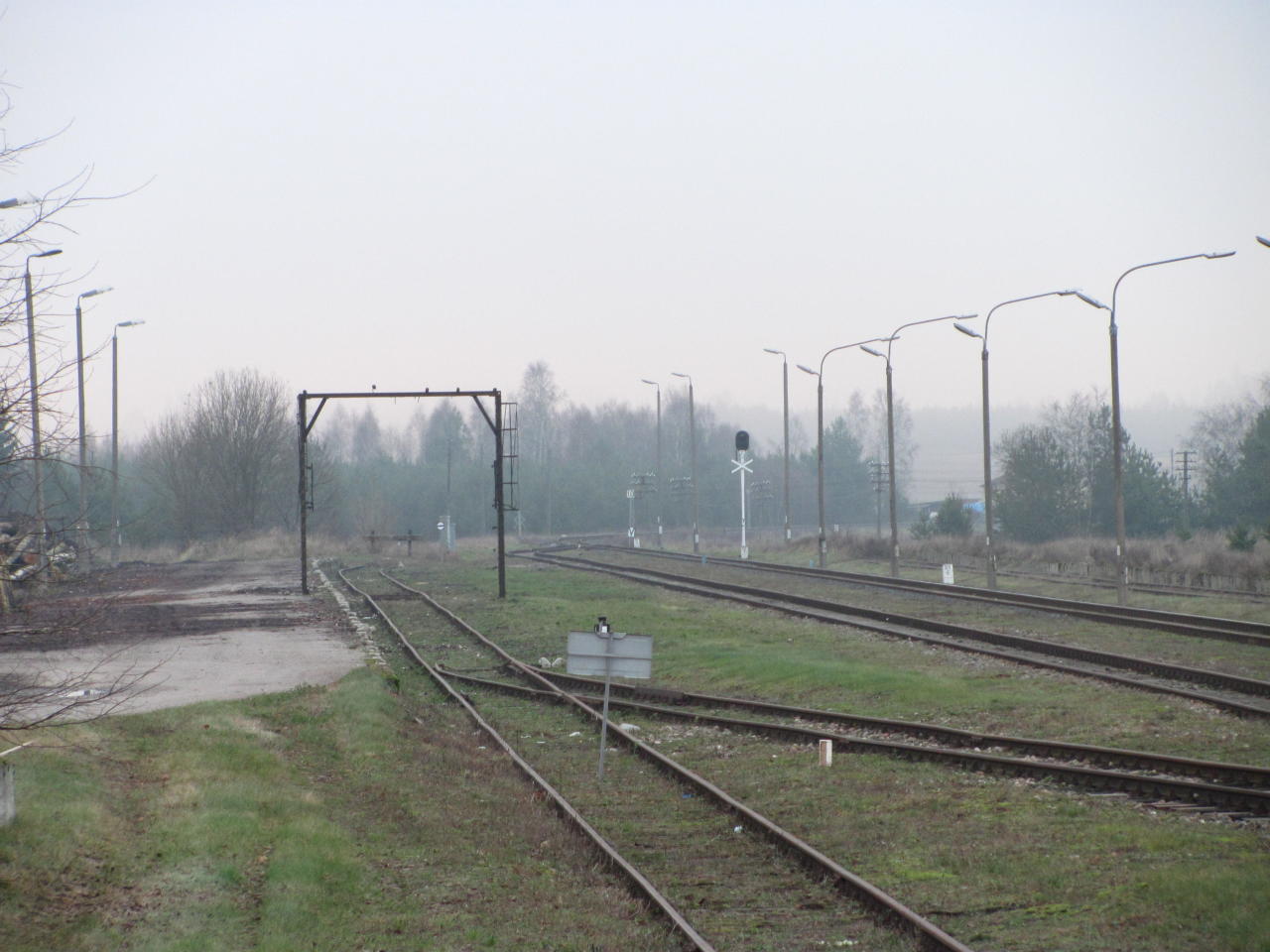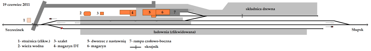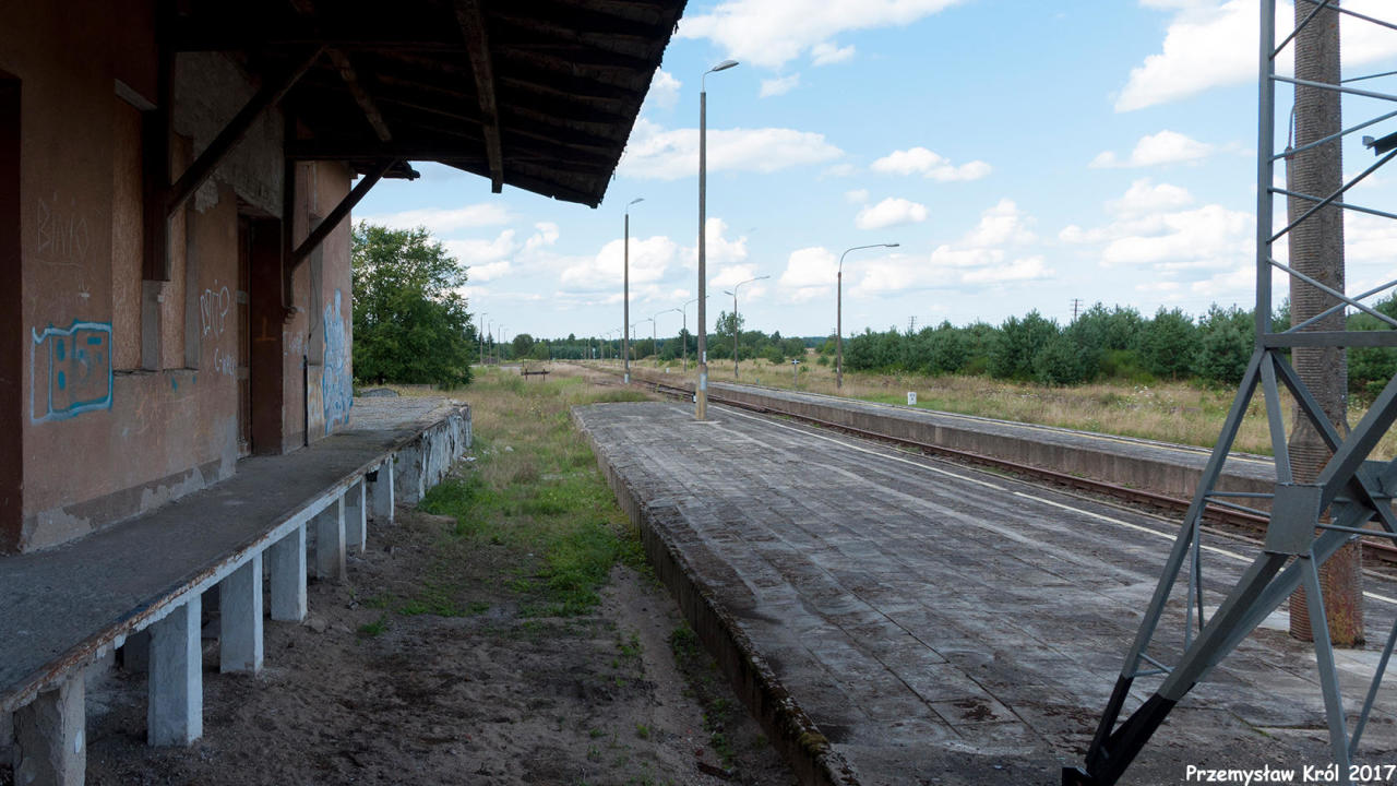 Widok z peronu w kierunku Słosinka/Słupska. Na podstawie stopnia zardzewienia szyn można wnioskować, że czynny jest wyłącznie tor główny dodatkowy (choć z drugiej strony trochę drewna na placu leży). W głębi widoczna unieważniona tarcza wyjazdowa systemu Kappscha.