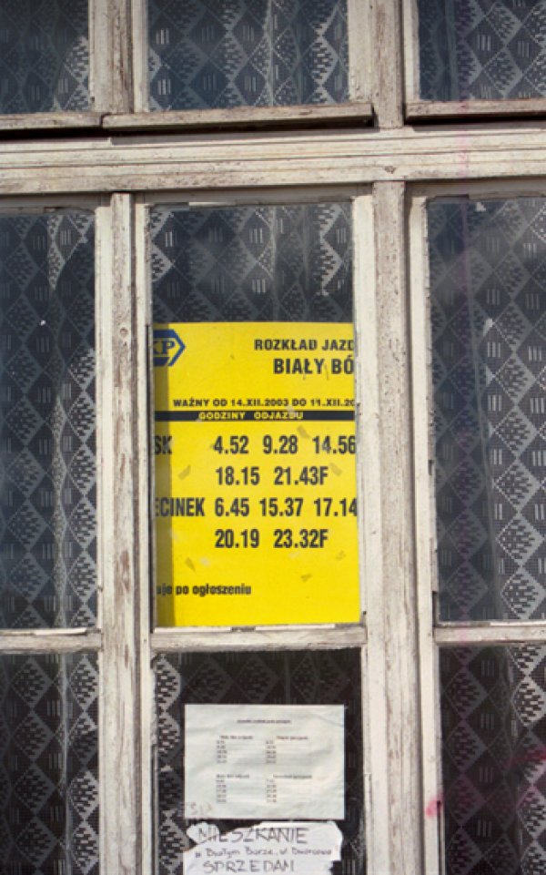 Rozkład jazdy zawieszony w oknie budynku dworca.
