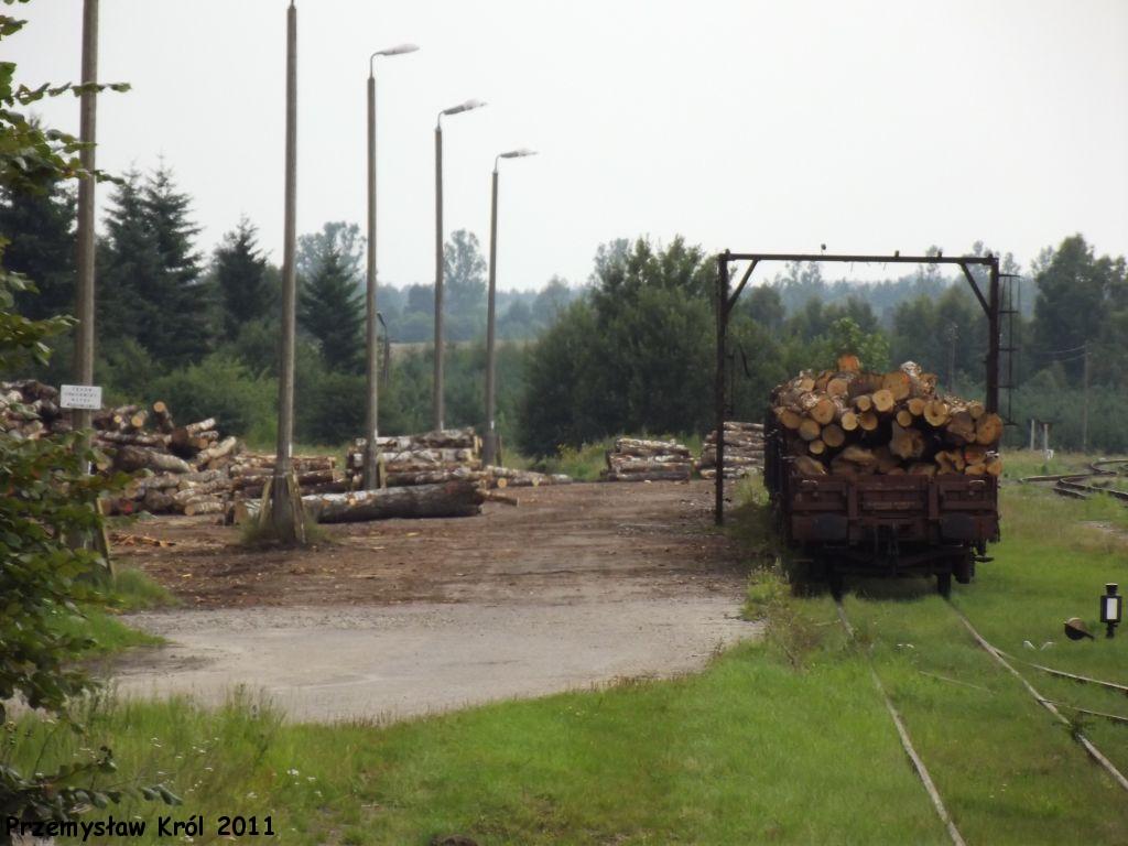 Ładunek drewna na platformie stojącej przy placu przeładunkowym, czeka na zabranie. Widok od strony peronów w kierunku Słosinka/Słupska.