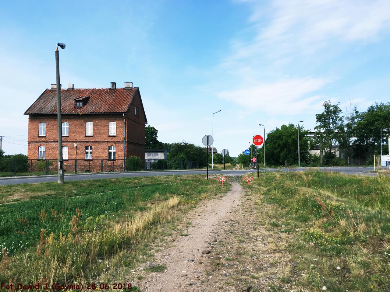 Ścieżka rowerowa w miejscu gdzie kiedyś były tory. Widok w kierunku Tamy Brodzkiej. Po lewej stronie zamieszkały budynek towarzyszący.