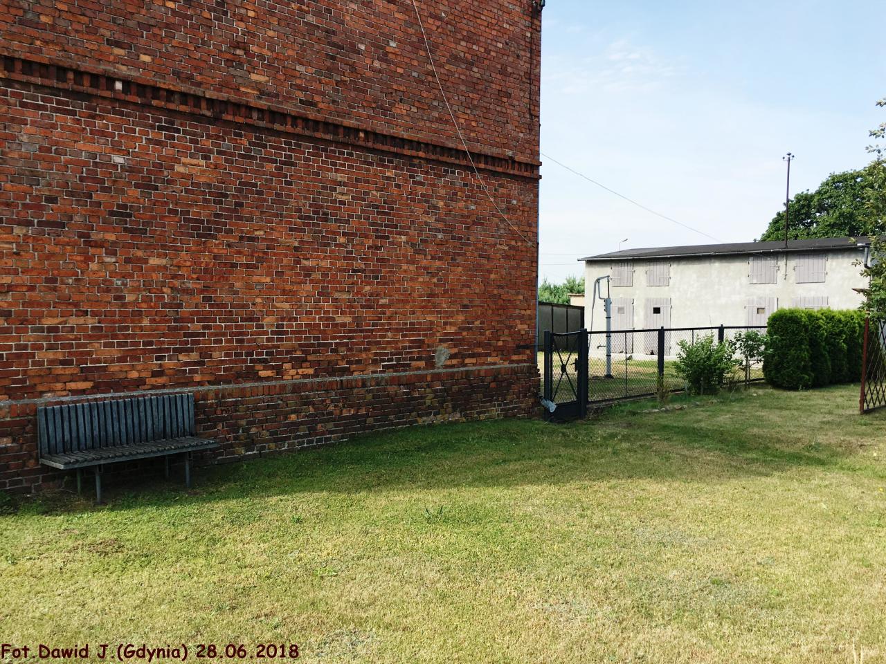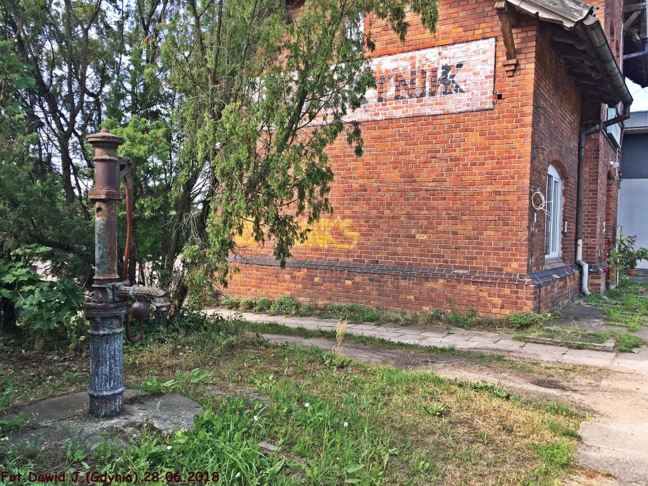 Zachowana niebieska ławka dworcowa przy zamieszkałym budynku towarzyszącym i obok pompa nr 2.