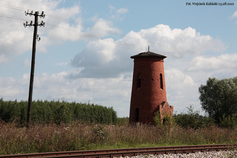 Od strony Olecka kolejowa wieża ciśnień z okazałym wejściem. Zwieńczenie dachu sprawia wrażenie przeróbek związanych z działaniami wojennymi, ewentualnie zmianą planów w trakcie realizacji. (info: Paweł Szrajber, 26-10-2013). jest, stan zewnętrzny podstawy dobry - brak części zbiornikowej, wewnętrzny - nierozpoznany |