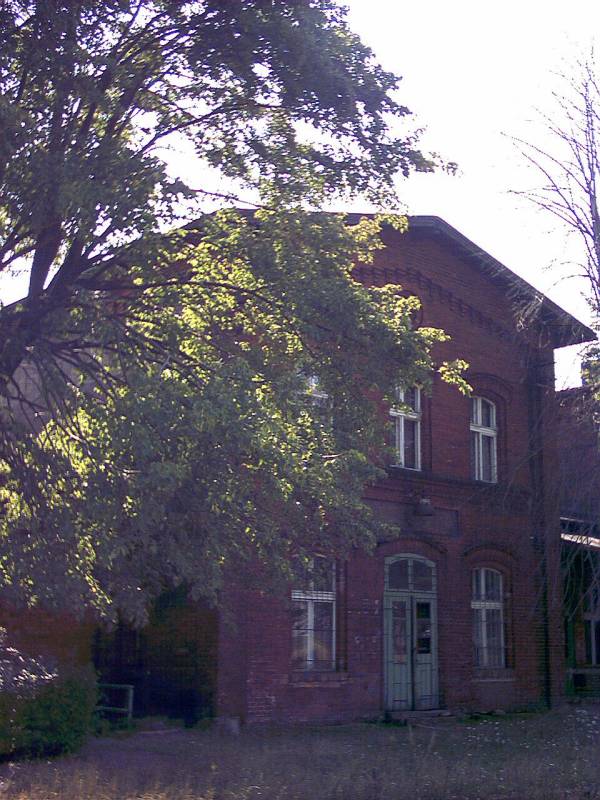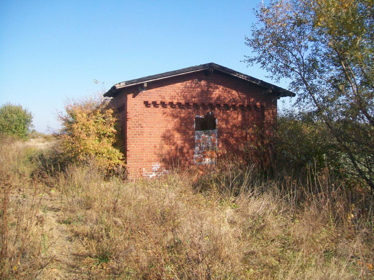 Zdewastowany i opuszczony budynek pokolejowy stojący na północno-wschodniej głowicy dawnej stacji, pochodzący z czasów lokalnej kolei do Szydłowa. Widok w kierunku północno-wschodnim (Brzeg).