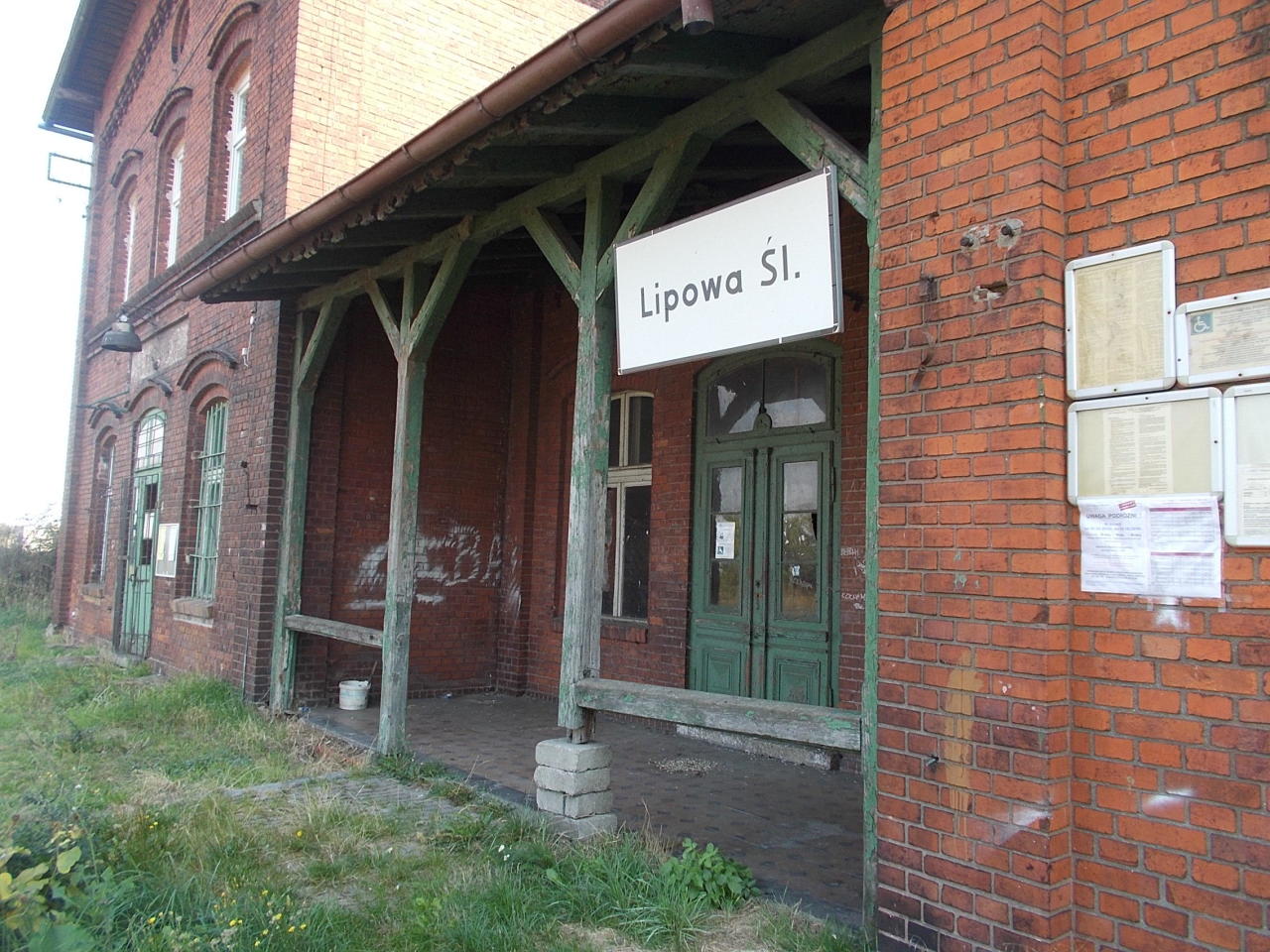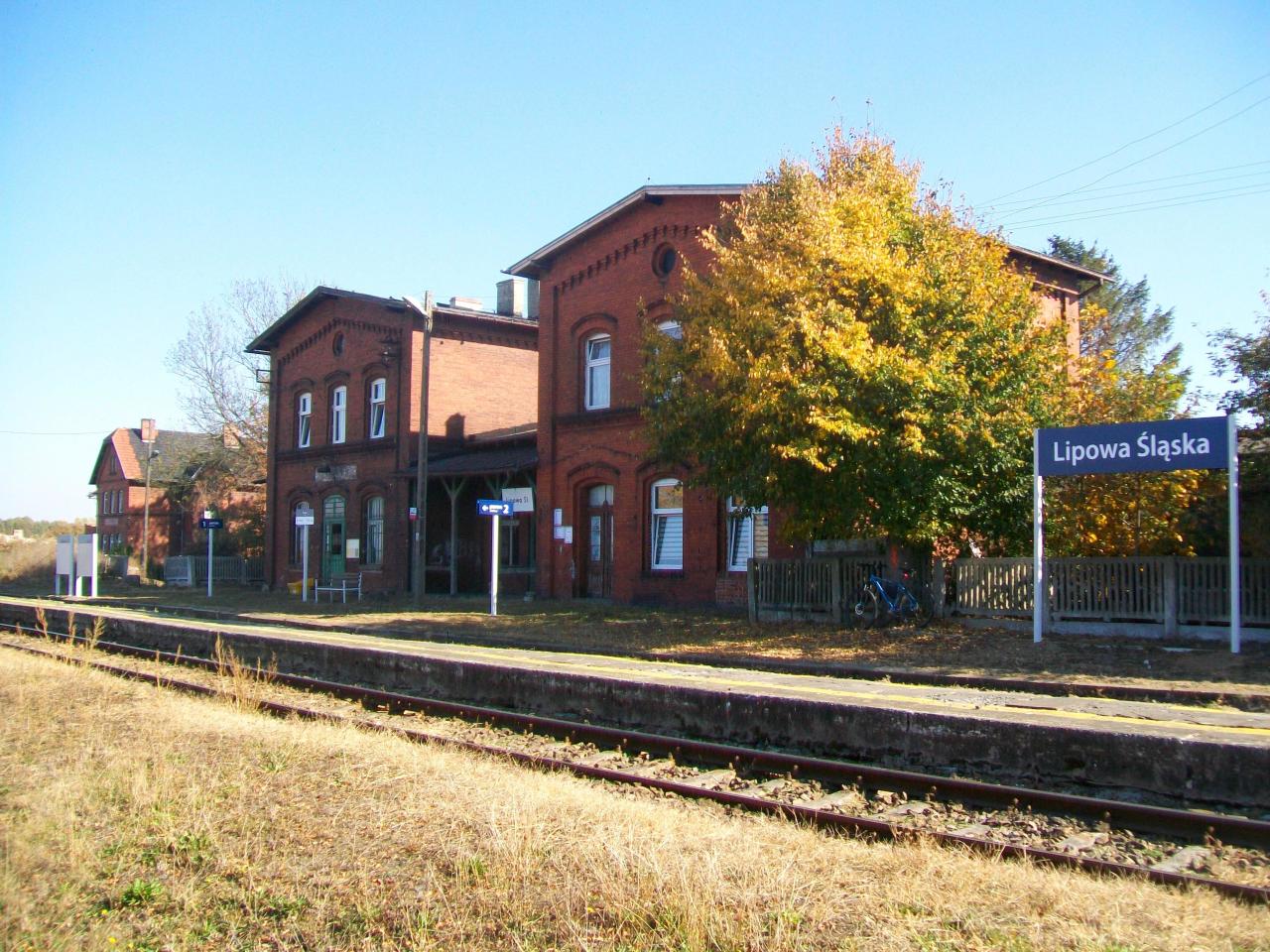 Lipowa Śląska. Budynek dworca od strony peronów. Widok w kierunku południowo-wschodnim: w lewo Brzeg, w prawo Grodków Śląski/Nysa, dawniej także Szydłów.