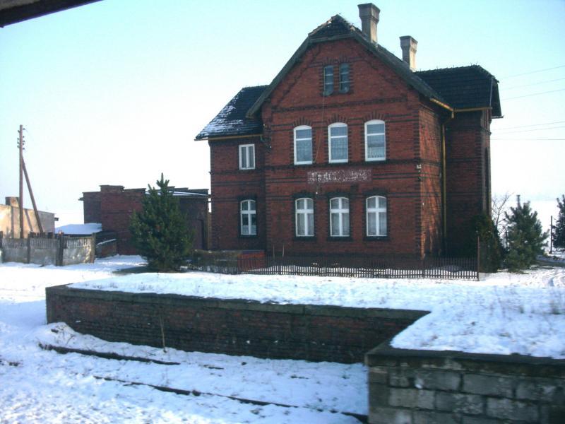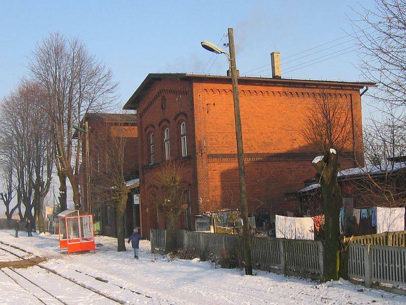 Budynek dworcowy widoczny od strony torów, w kierunku wschodnim: w lewo Brzeg, w prawo Grodków Śląski/Nysa, dawniej także Szydłów. Kolejowy budynek mieszkalny nr 104 po lewej stronie.