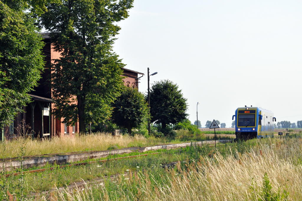 Jest godzina 17:59. Gorącym, letnim popołudniem wtacza się punktualnie pociąg do Brzegu. Frekwencja ostatnim czasy dopisuje, co cieszy każdego. Z lewej budynek dworca i kolejowy budynek mieszkalny. Widok w kierunku południowym, od strony Brzegu.