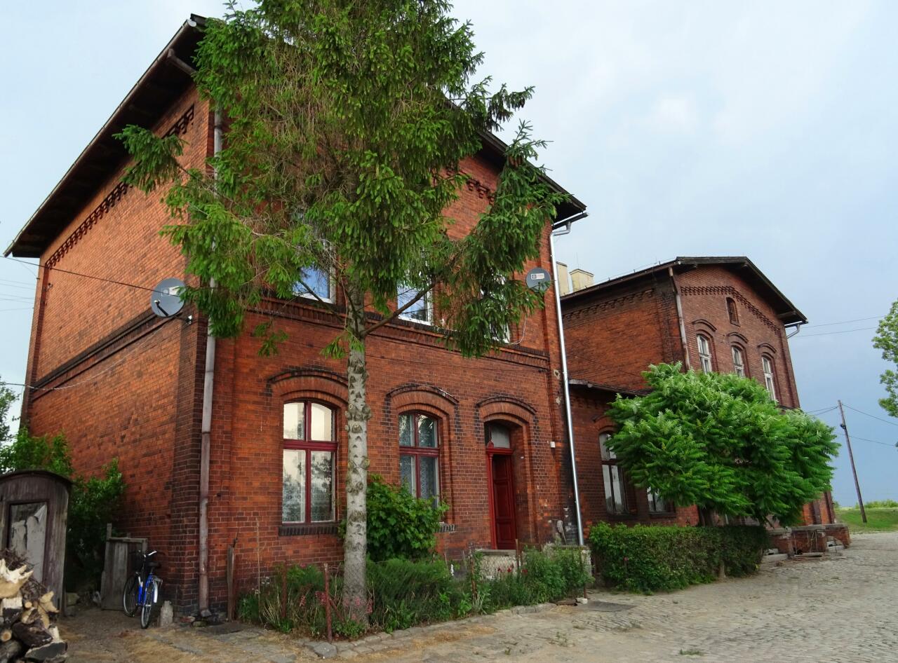 Kolejowy budynek mieszkalny nr 104 widoczny od strony torów. Kierunek południowo-wschodni: w prawo dworzec i perony, w lewo Brzeg.