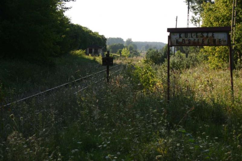 Kiedy kilka lat temu wsiadałam tu do pociągu, wyglądało to nieco inaczej. Co prawda była już tylko wiata i zarośnięty trawą peron, ale stacyjka wyglądała jeszcze przyzwoicie. Teraz przyszłam zobaczyć jak tu wygląda, kiedy pociągi przestały już tamtędy jeździć. Po torach można teraz tylko pospacerować. Na zdjęciu idę od strony Łap i pokazuję dzieciom szlak kolejowy, którego za kilka lat nie będzie już wcale widać.