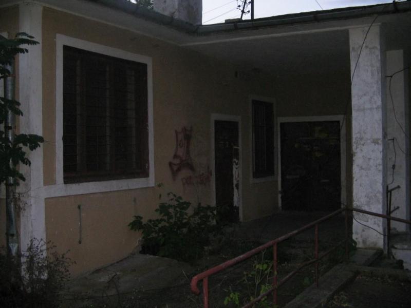Widok na zakrzaczony budynek stacyjny - będący lustrzanym odniciem budynku w Sokołach.