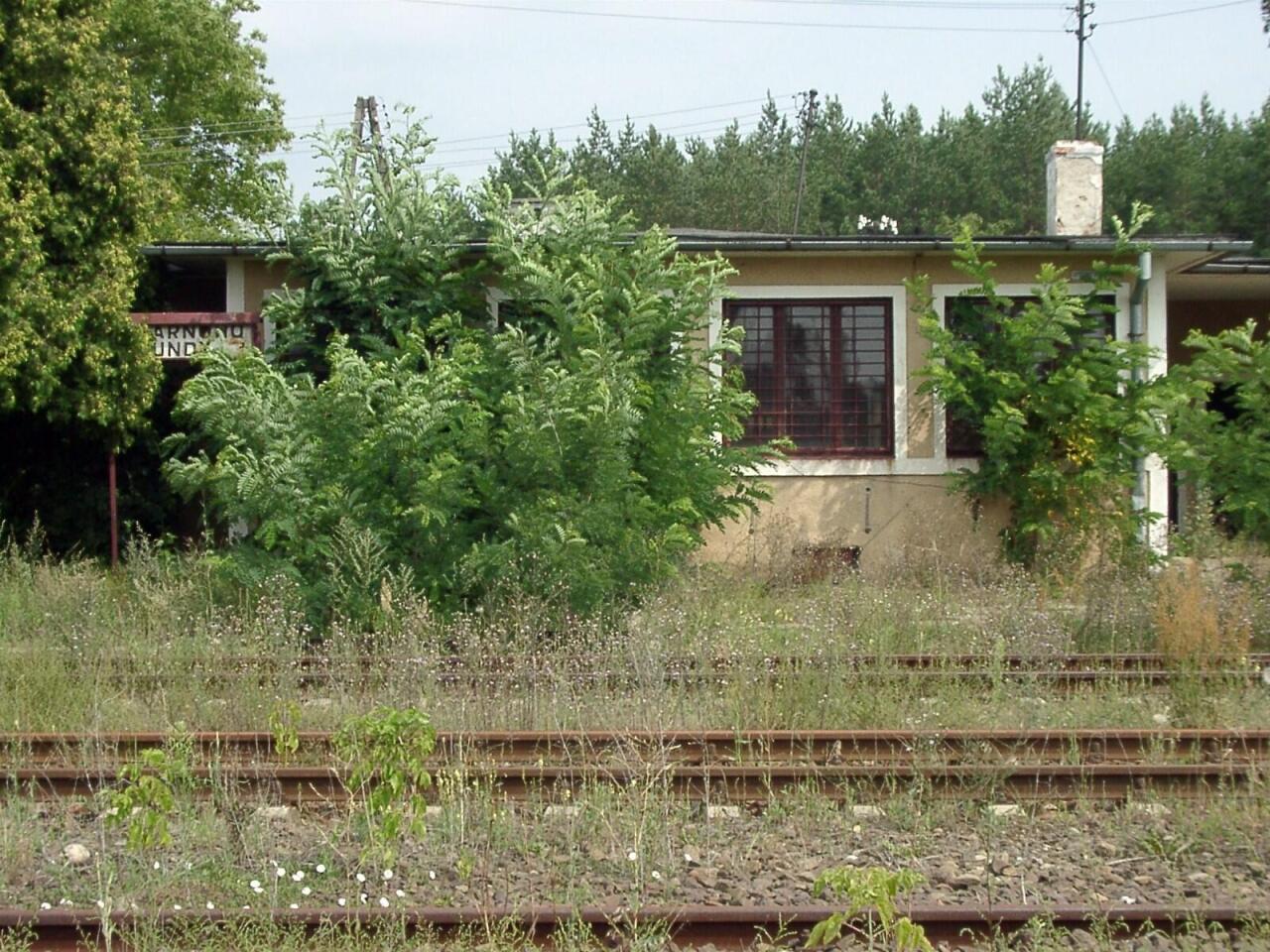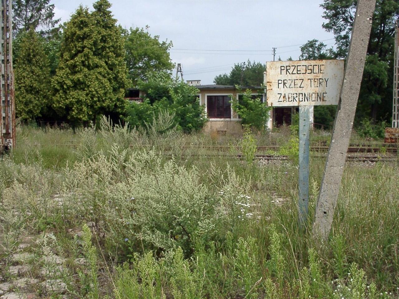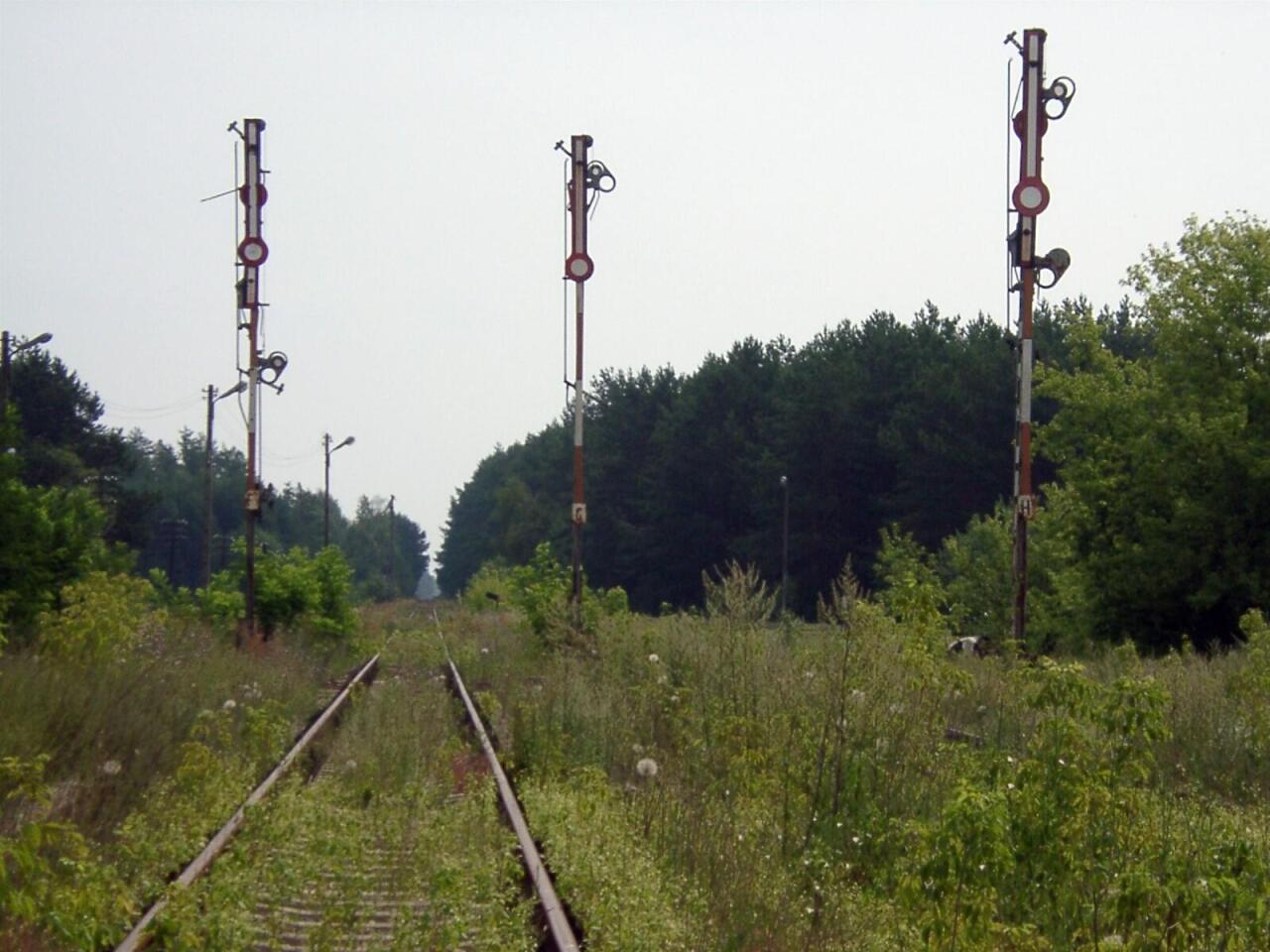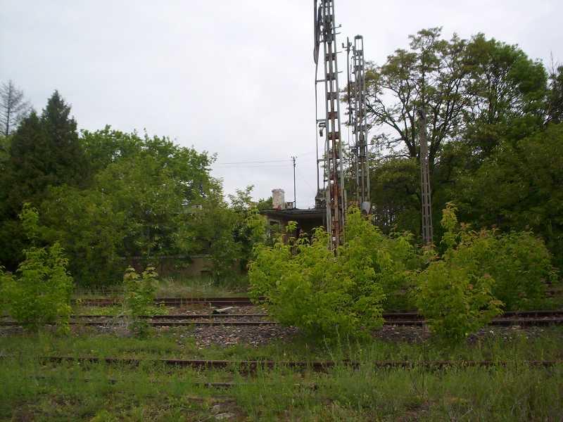 Widok z placu na stację. Skorodowana tablica, po prawej "zwieszone" semafory, a na drugim planie zza obfitą roślinnością budynek stacyjny.