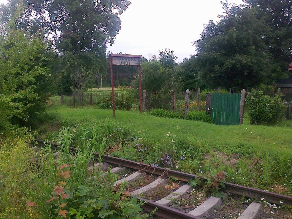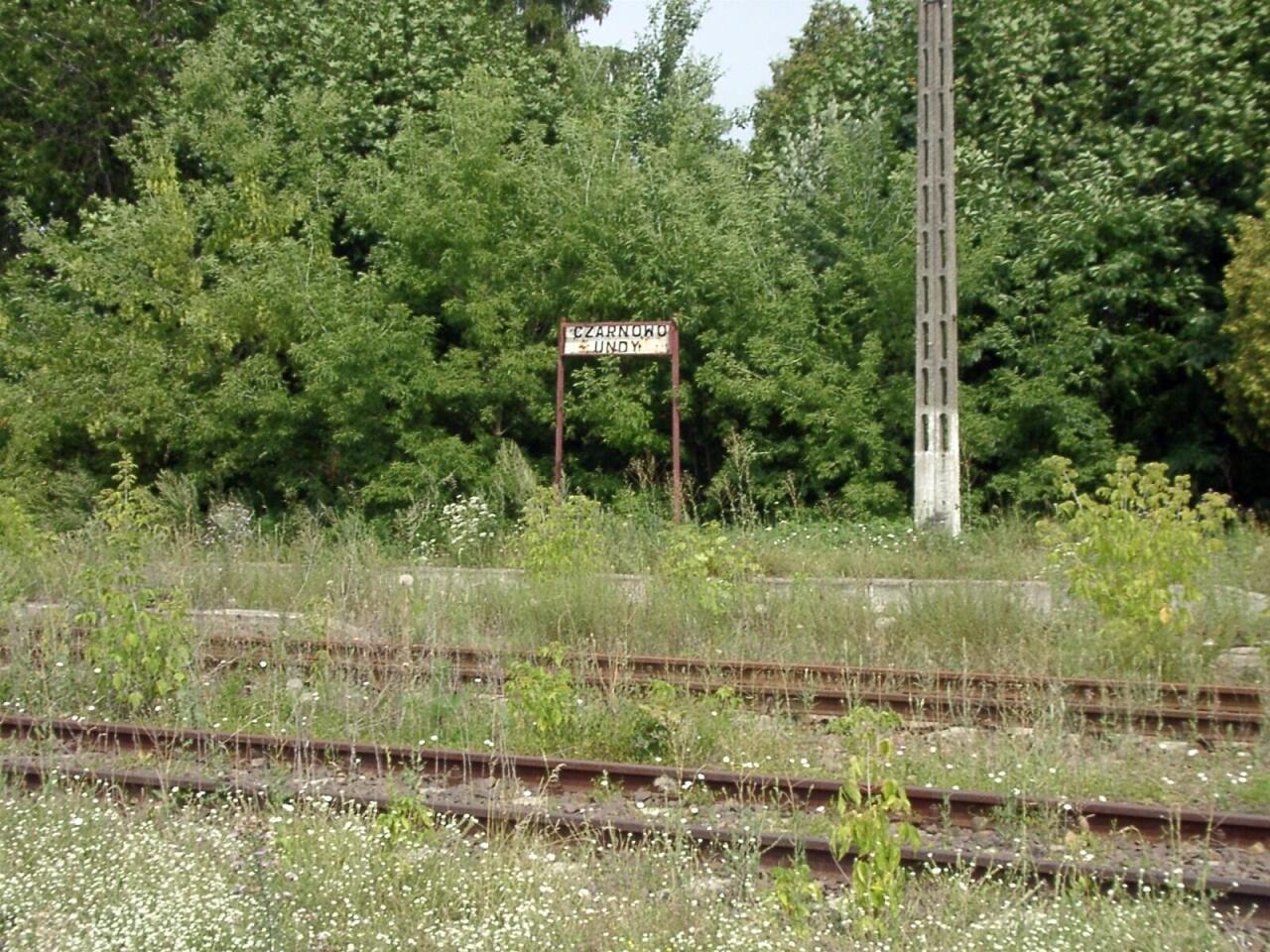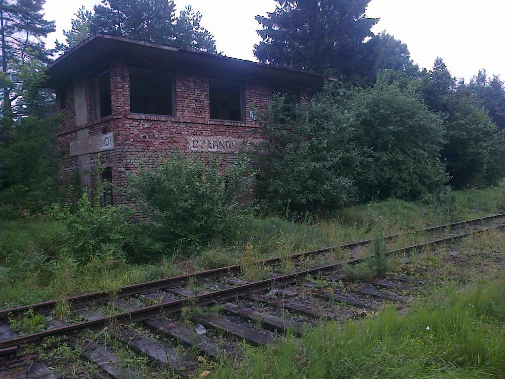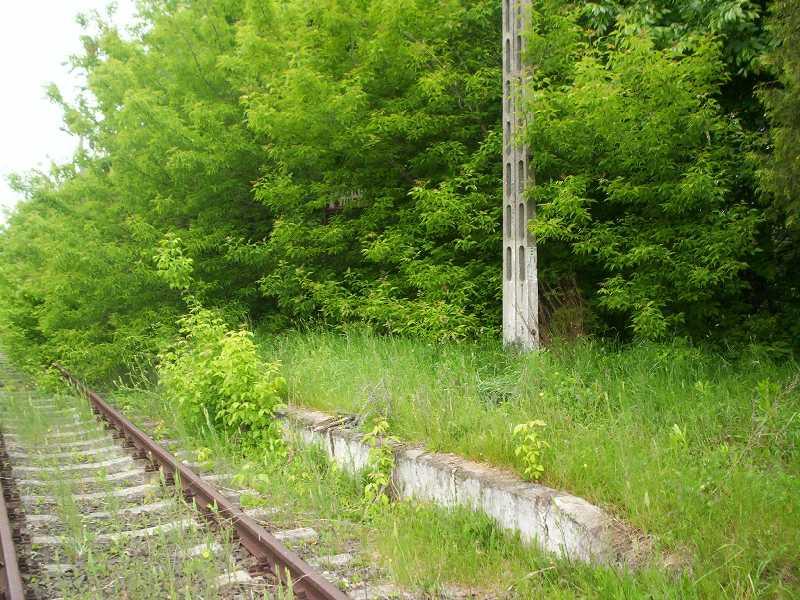 Widok z placu na stację. Skorodowana tablica, po prawej "zwieszone" semafory, a na drugim planie zza obfitą roślinnością budynek stacyjny.