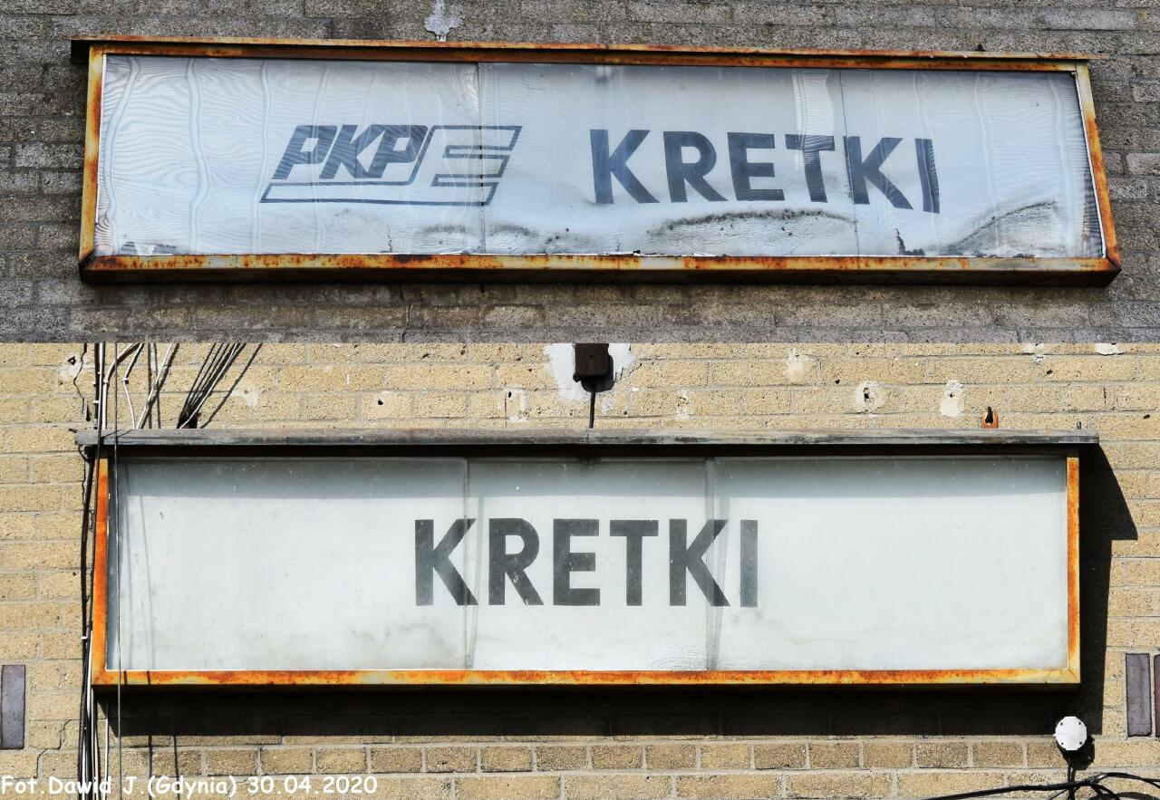Tablice z nazwami stacji, sprzed kilkudziesięciu lat. Tablice umieszczone są na budynku dworcowym, po różnych stronach.