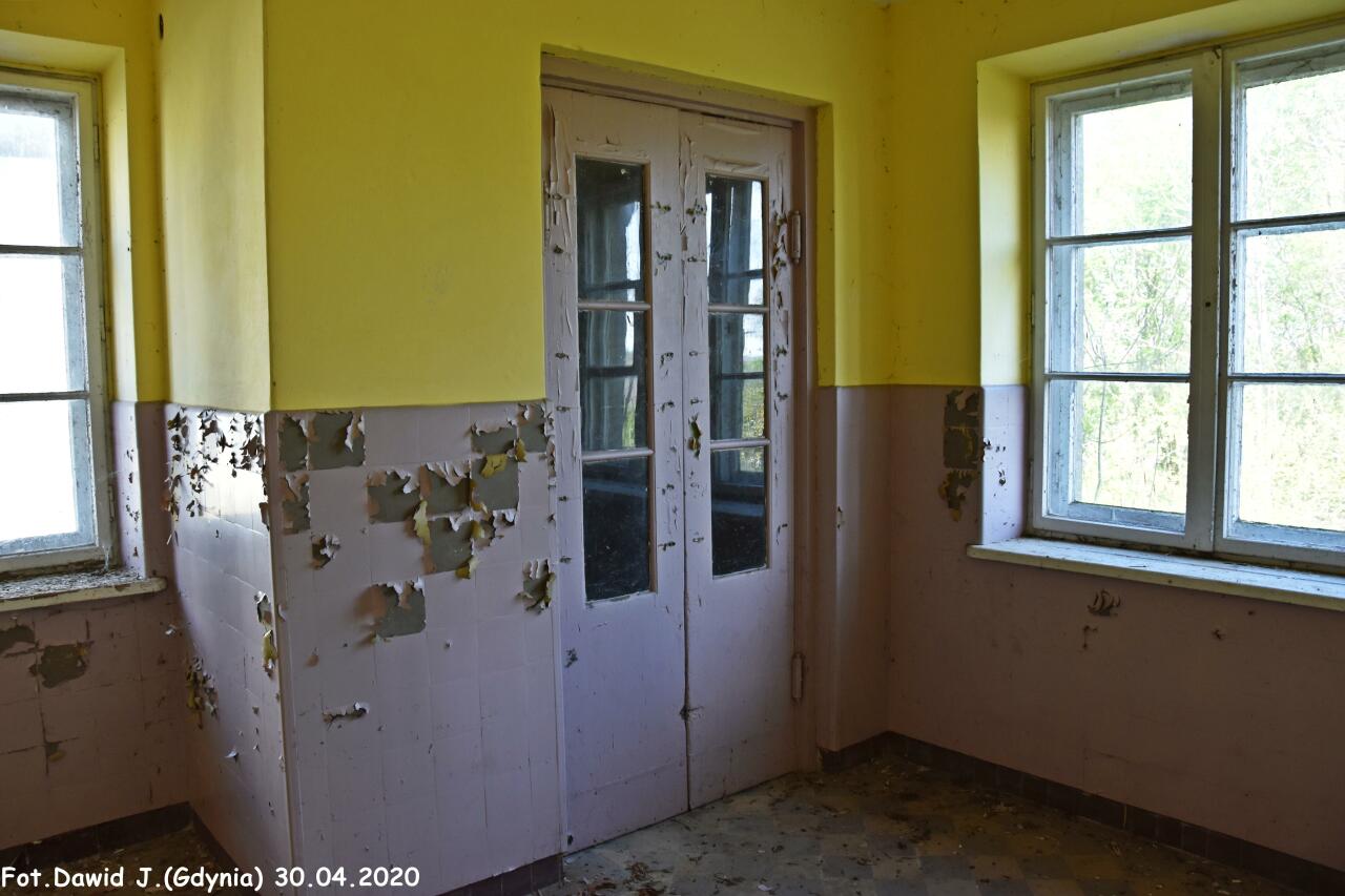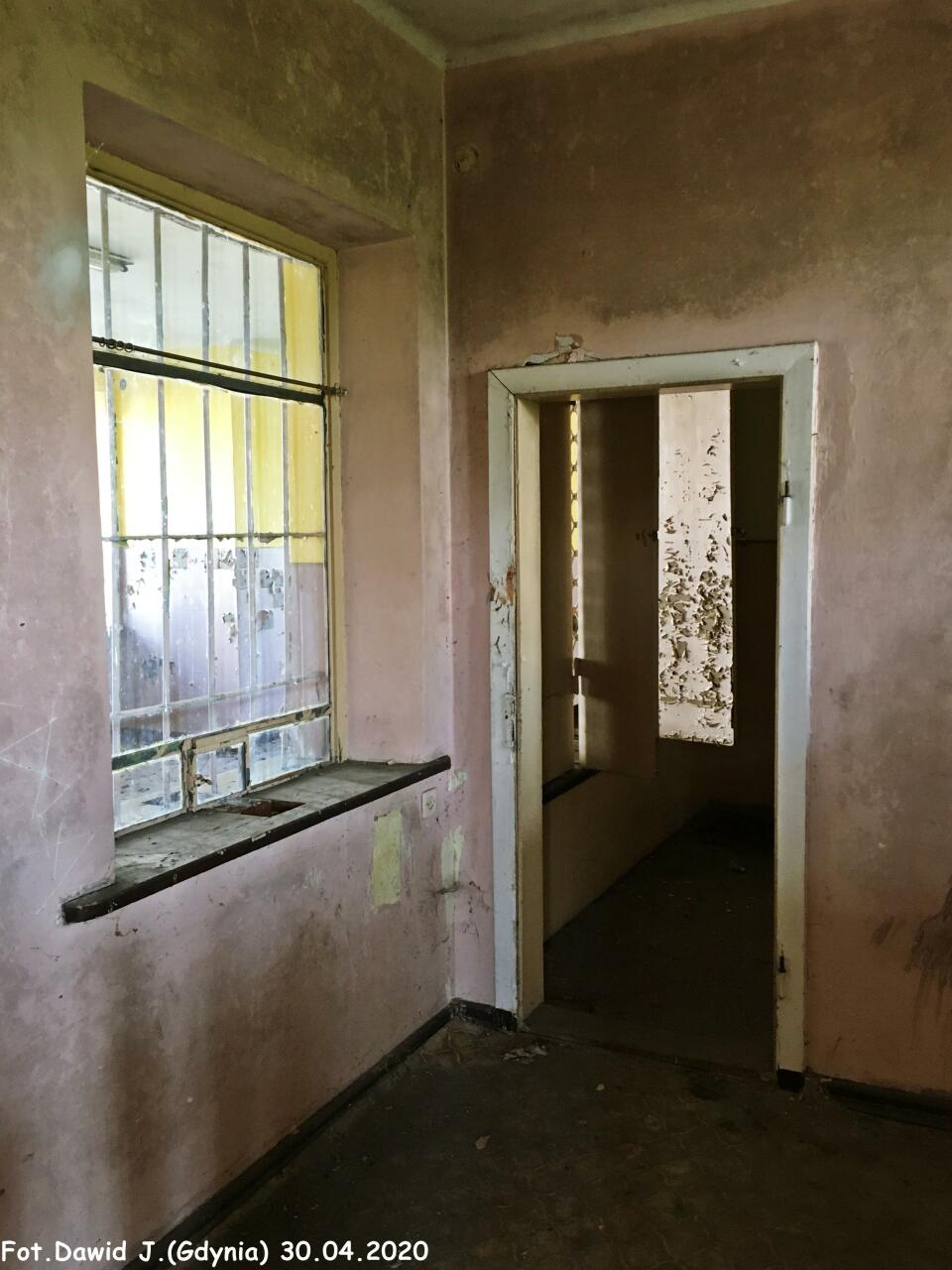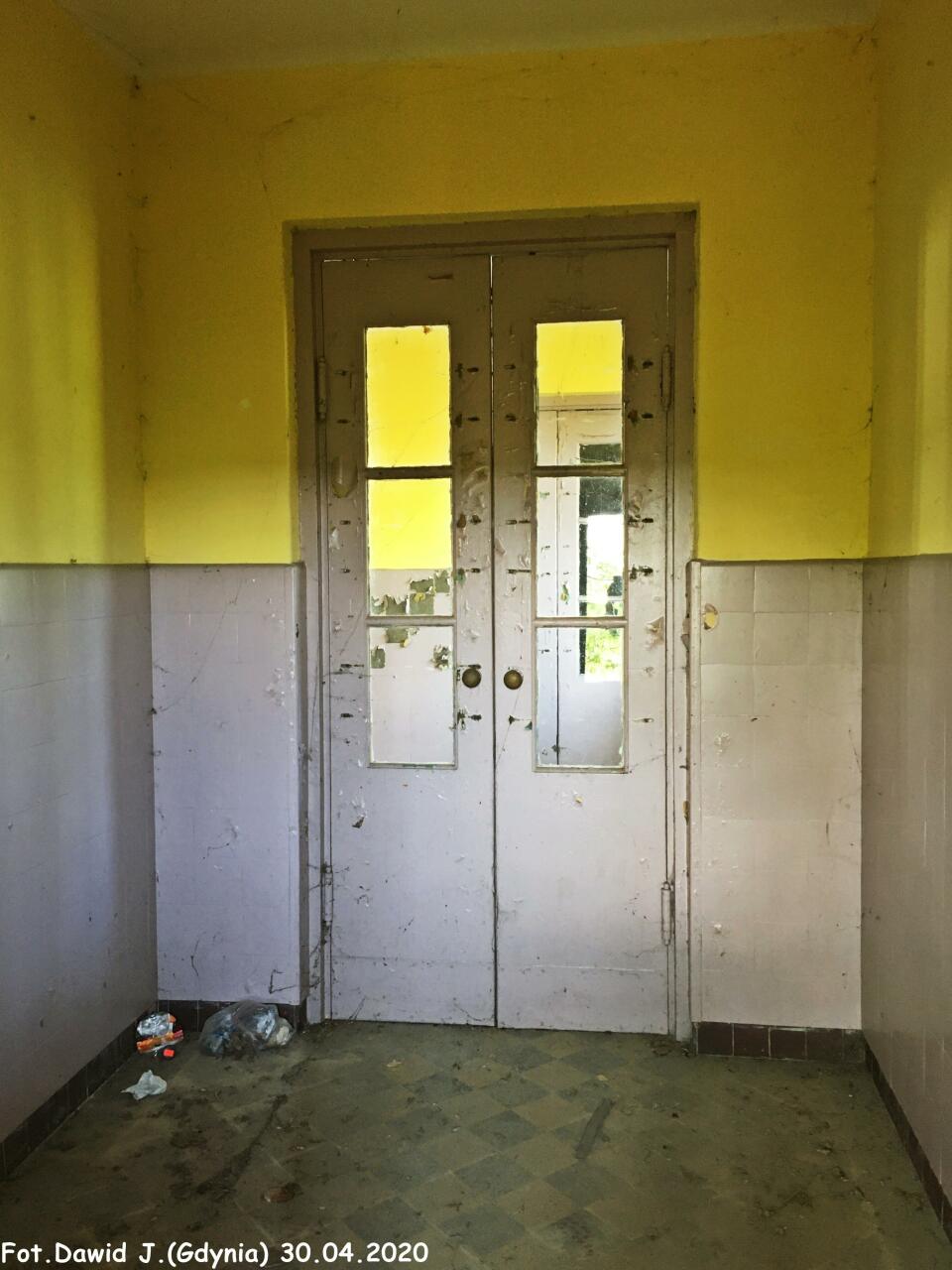 Wnętrze budynku dworcowego. Nieczynna poczekalnia dla podróżnych. Po lewej stronie znajduje się zamknięte wyjście do miejscowości, po prawej stronie znajduje się zamknięte wyjście na perony. Po prawej stronie znajduje się najprawdopodobniej dawne okienko kasy bagażowej.