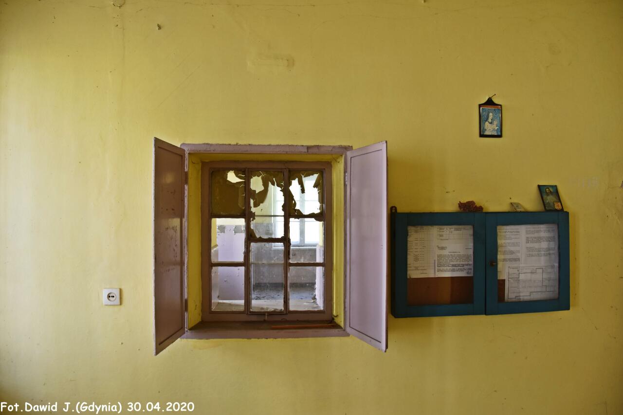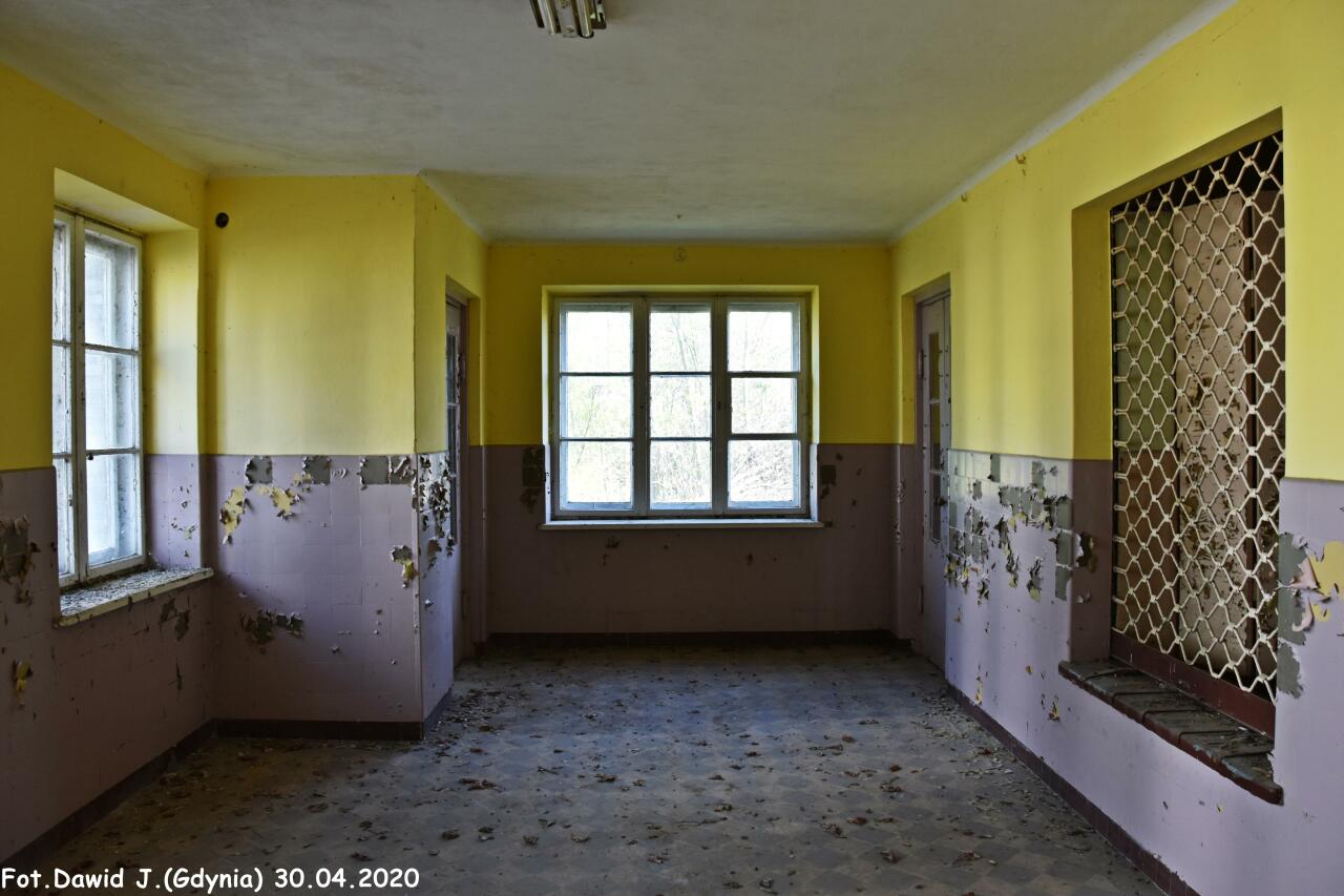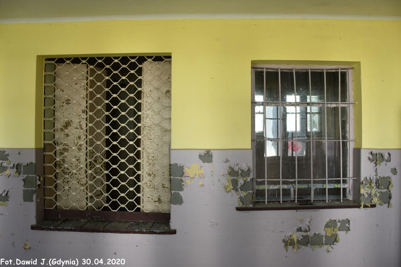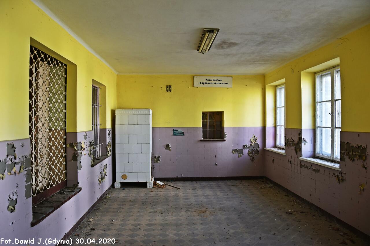Wnętrze budynku dworcowego. Nieczynna poczekalnia dla podróżnych. Po lewej stronie znajdują się: najprawdopodobniej dawne okienka kasy bagażowej i informacji. Na wprost znajduje się nieczynne okienko kasy biletowej.