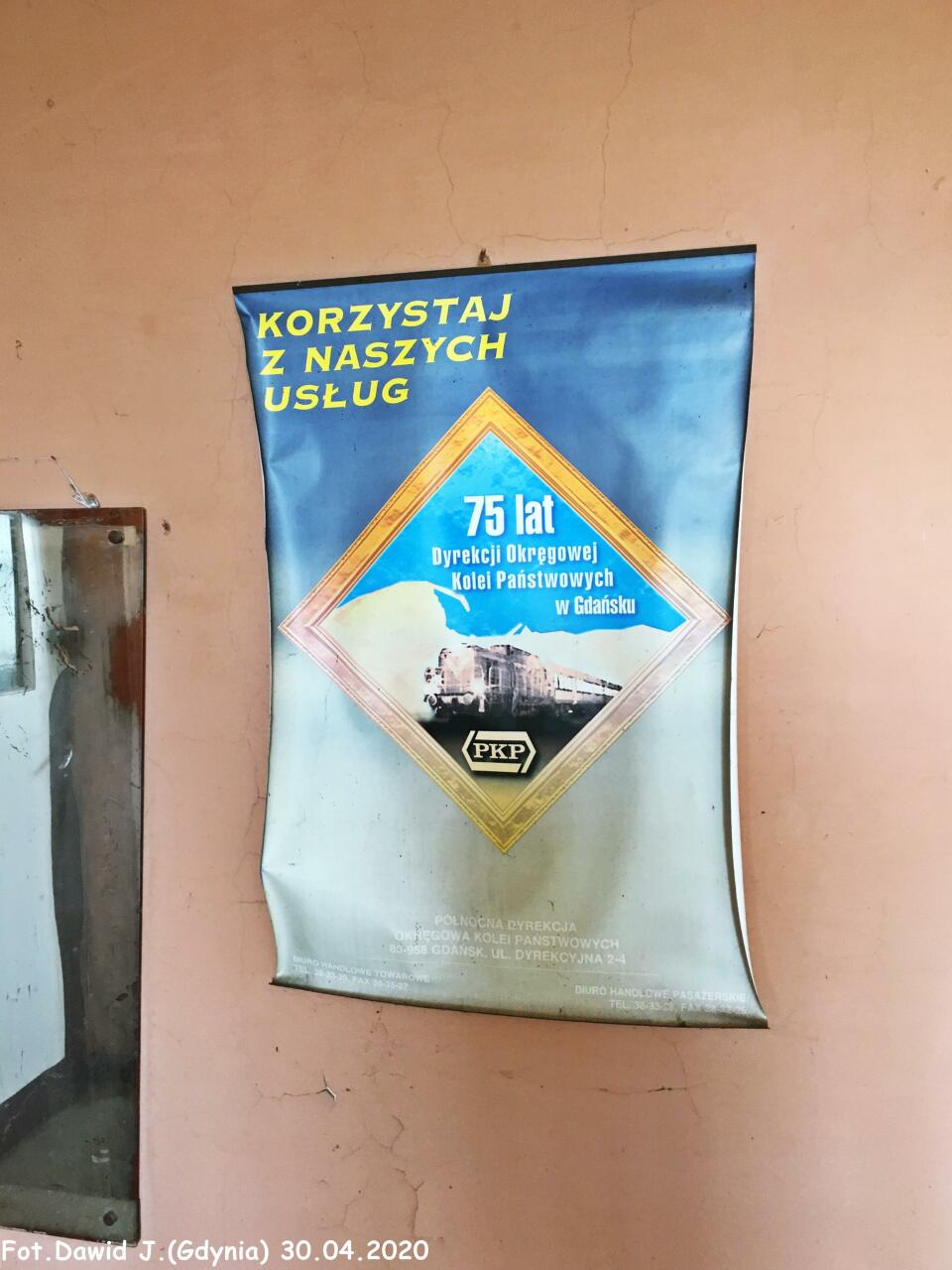 Wnętrze budynku dworcowego. Dawne pomieszczenie dyżurnego ruchu/nastawni. Plakat zachęcający do korzystania z usług kolejowych na nieczynnej stacji dla ruchu pasażerskiego.
