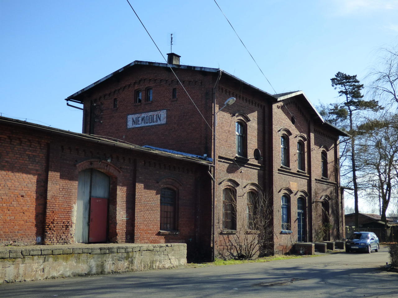Zachowany peron w Niemodlinie. W tle, po lewej budynek dworca. Widok od strony Szydłowa.