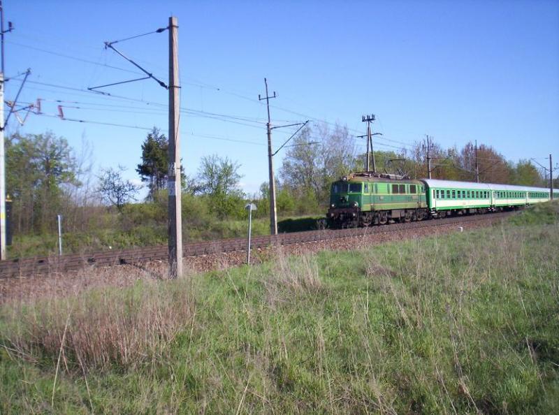 Świercze. Pociąg pospieszny mknie w strone Ciechanowa mijając wskaźniki W-5 w północnej głowicy stacji.