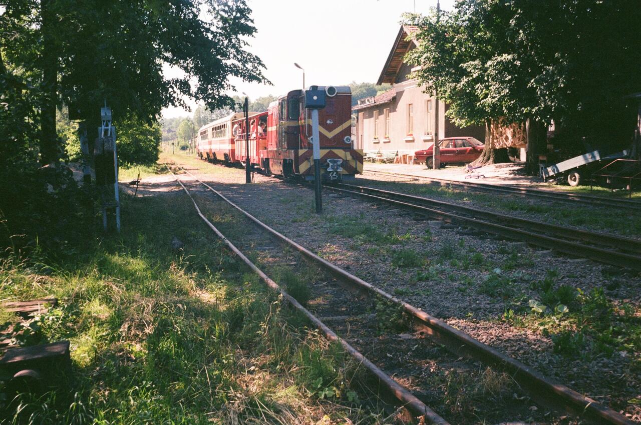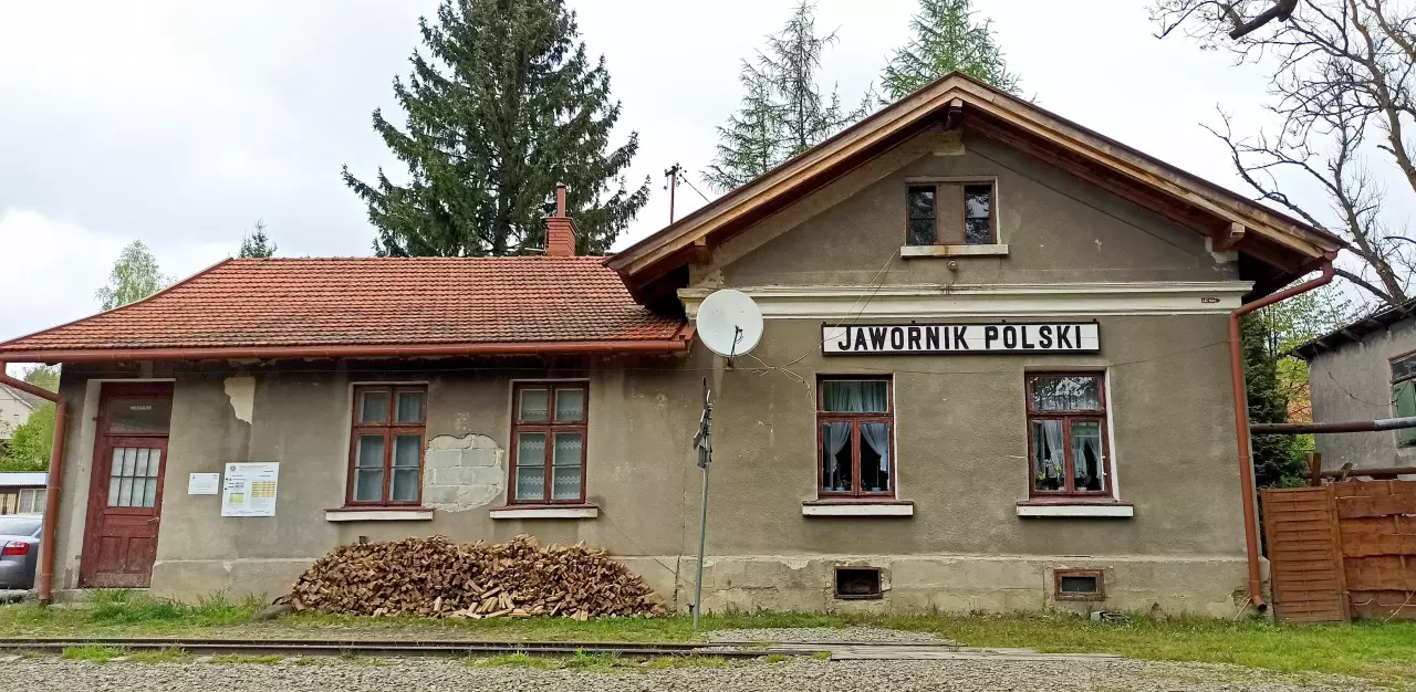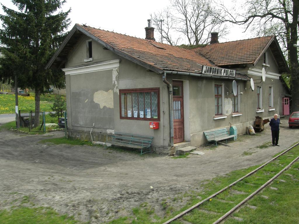 Stacja handlowa Jawornik Polski - budynek stacyjny, pociąg "POGÓRZANIN" TOS 856 relacji Dynów - Przeworsk Wąskotorowy, prowadzony lokomotywą Lxd2-251. Widok w kierunku stacji Przeworsk Wąskotorowy.