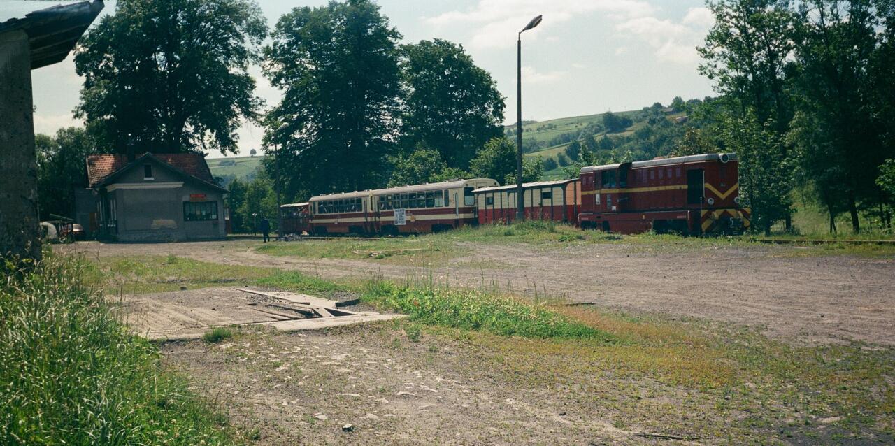 Stacja handlowa Jawornik Polski - tor 1, pociąg "POGÓRZANIN" TOS 855 relacji Przeworsk Wąskotorowy - Dynów, prowadzony lokomotywą Lxd2-251, widoczny plac ładunkowy i budynek stacyjny. Widok w kierunku stacji Przeworsk Wąskotorowy.