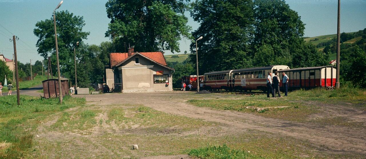 Stacja handlowa Jawornik Polski - waga wozowa, plac ładunkowy, budynek stacyjny, pociąg "POGÓRZANIN" TOS 855 relacji Przeworsk Wąskotorowy - Dynów, prowadzony lokomotywą Lxd2-251. Widok w kierunku stacji Przeworsk Wąskotorowy.