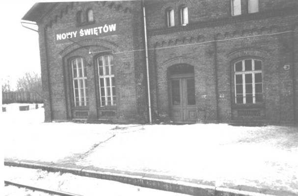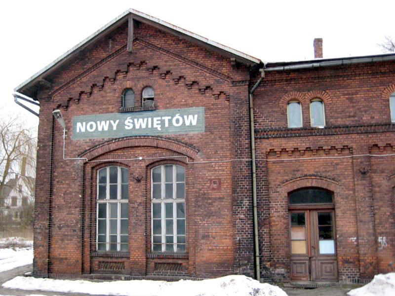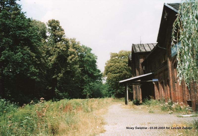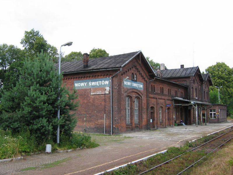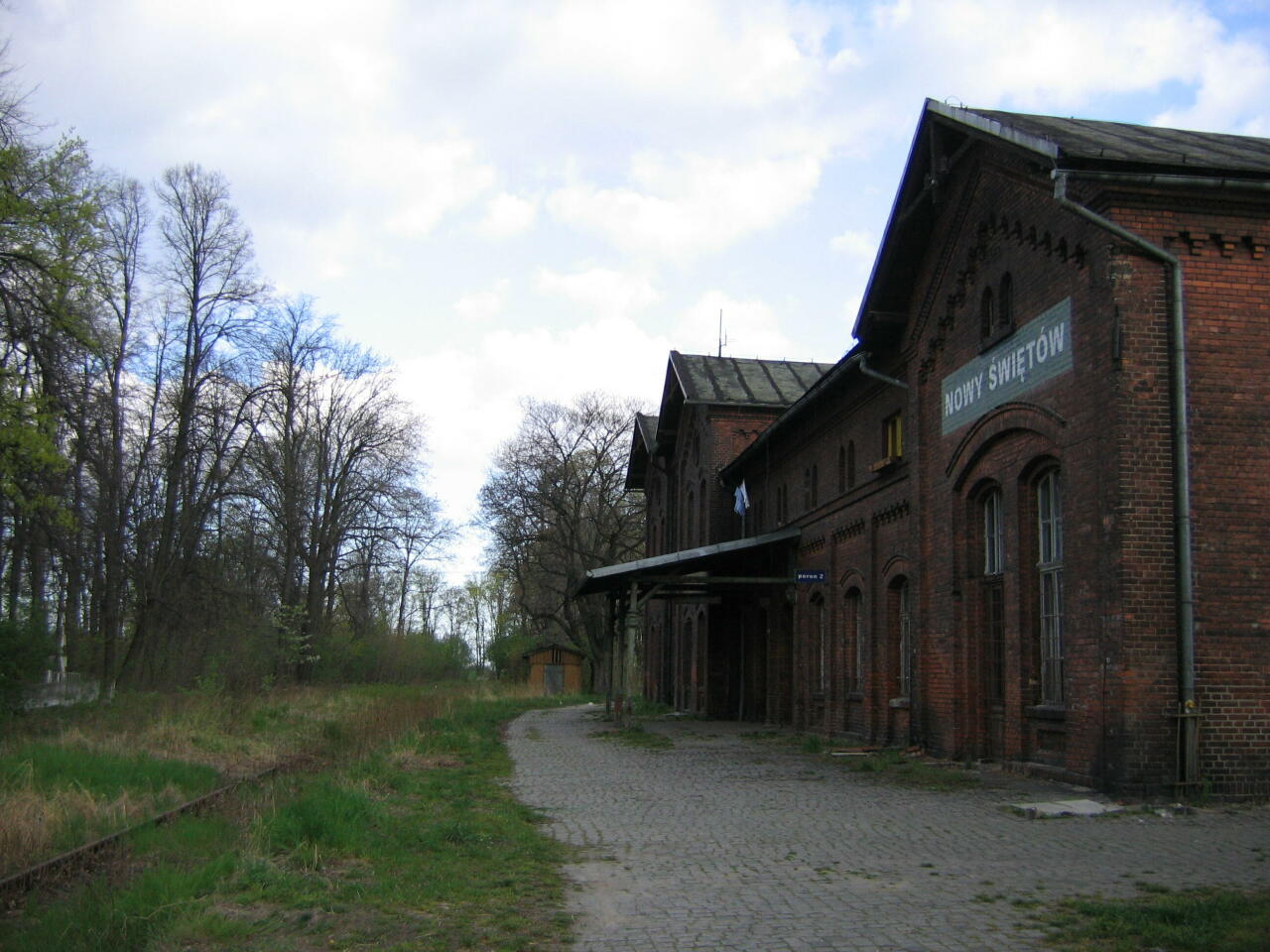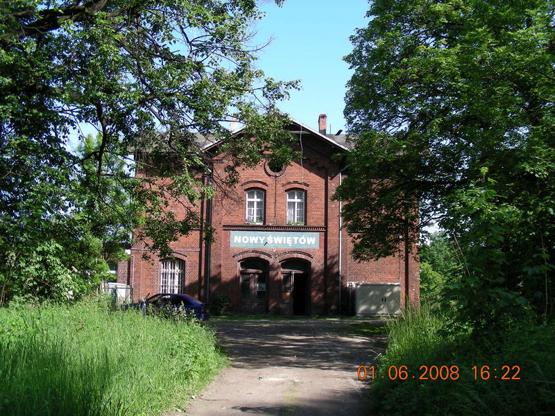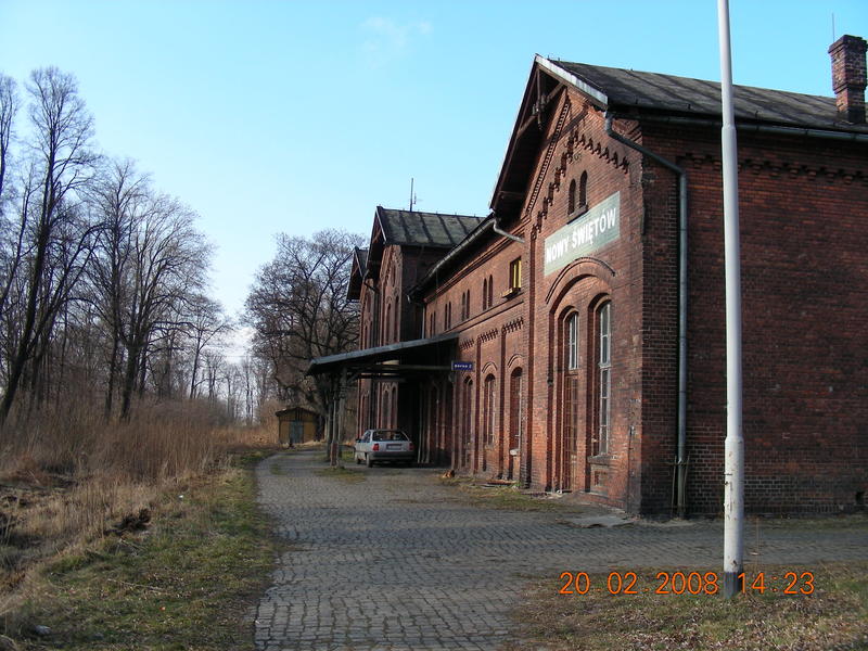 Budynek dworca w Nowym Świętowie od strony podjazdu. Z lewej strony perony 1 i 2 (przelotowe), położone po zachodniej stronie dworca. Z prawej strony perony 3 i 4 (czołowe), położone po wschodniej stronie dworca. Widok w kierunku południowo-wschodnim, od strony wjazdu z Nysy (perony 1 i 2) i kozłów oporowych (perony 3 i 4).