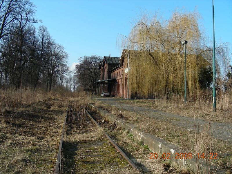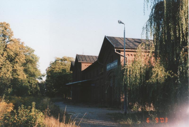 Nowy Świętów. Budynek dworca od strony peronów 3 i 4, położonych po jego zachodniej stronie, z których odjeżdżały pociągi relacji Nowy Świętów - Głuchołazy Zdrój, a jeszcze wcześniej także do Sławniowic. Widok w kierunku północno-zachodnim, od strony wjazdów z Głuchołaz i (dawniej) Sławniowic.