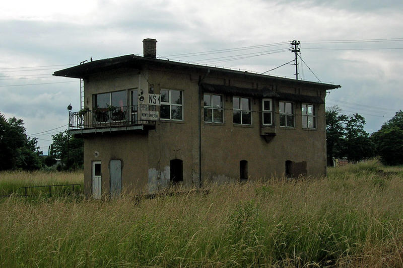 Nastawnia wykonawcza. Widok od strony torów wjazdowych z Prudnika, w kierunku zachodnim: w prawo perony, w lewo Prudnik i (za nastawnią) Głuchołazy, dawniej także Sławniowice.