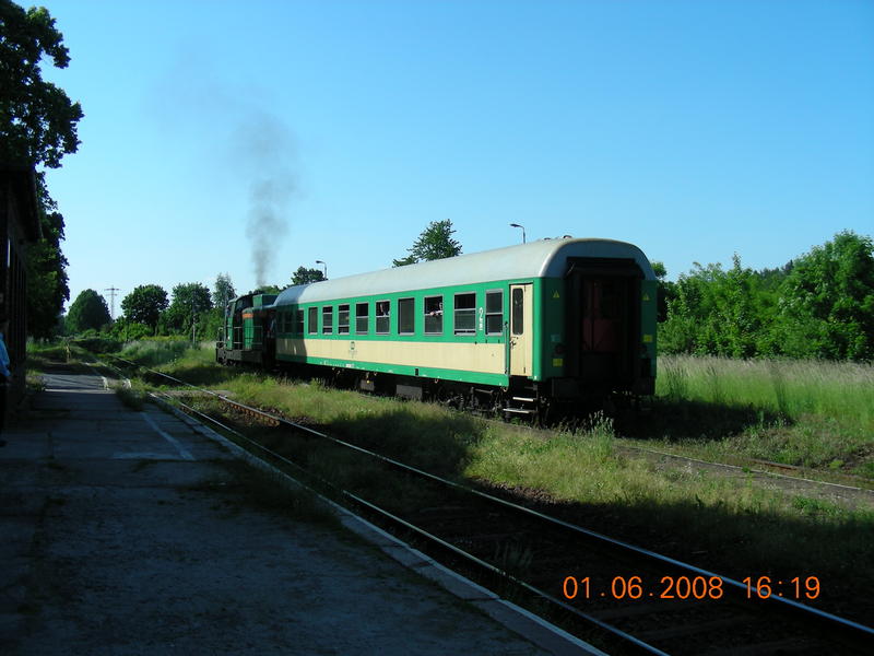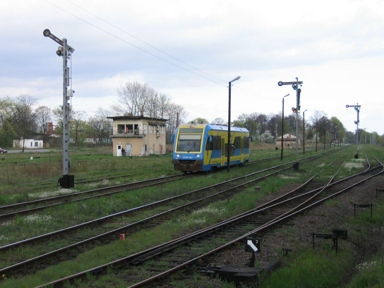 Pociąg osobowy wyjeżdżający w stronę Prudnika. Z lewej nastawnia wykonawcza. Na lewo od niej znajdują się tory wjazdowe z Głuchołaz i (dawniej) Sławniowic. Widok w kierunku północno-zachodnim, od strony wjazdu z Prudnika.