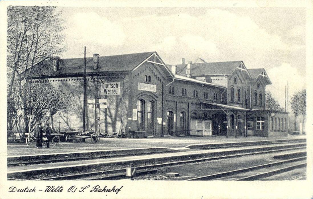 Widok od strony drogi dojazdowej na zachodnią grupę torów. W centrum kadru tender po parowozie i zachodnia część budynku dworca z peronami 3 i 4. Widok w kierunku północnym: w prawo Prudnik, Głuchołazy, dawniej także Sławniowice.
