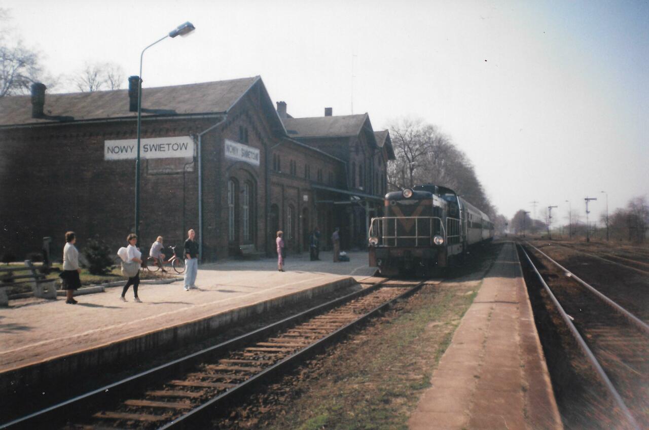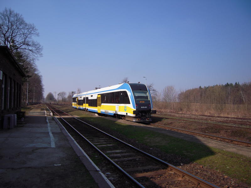 Nowy Świętów. Pociąg Kędzierzyn Koźle - Nysa, na stacji Nowy Świętów. Odjeżdża w kierunku Nysy. Jest to skład zastępczy po awarii szynobusu SA 103 - 003. Wschodnia strona dworca (z lewej, poza kadrem), z peronami 1 i 2. Widok w kierunku północno-zachodnim.