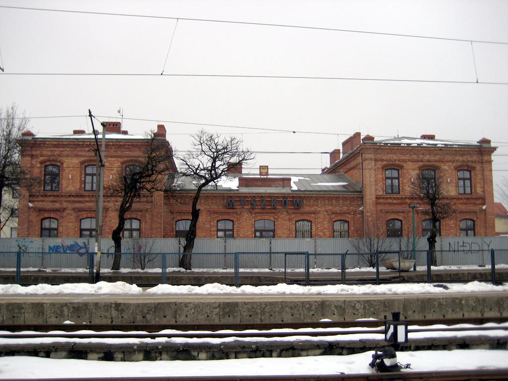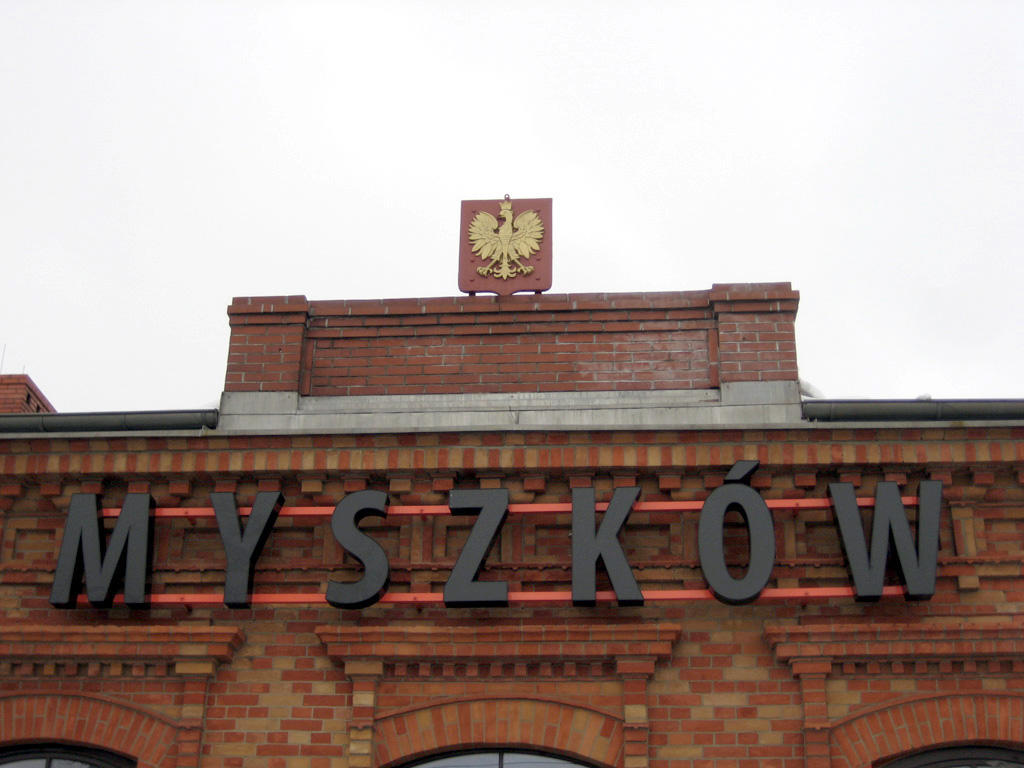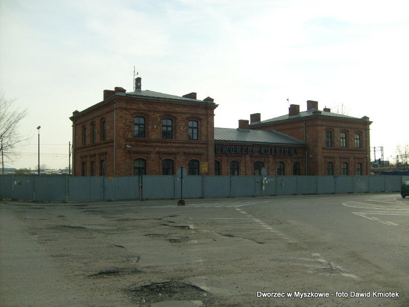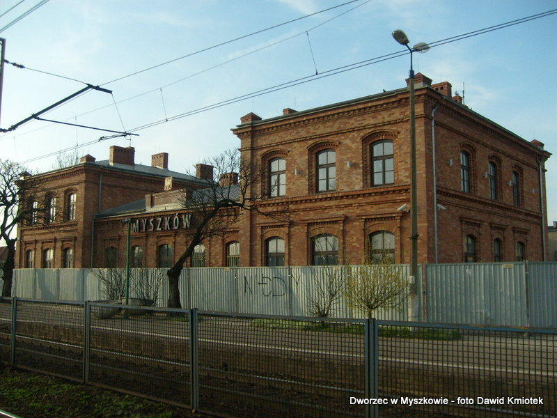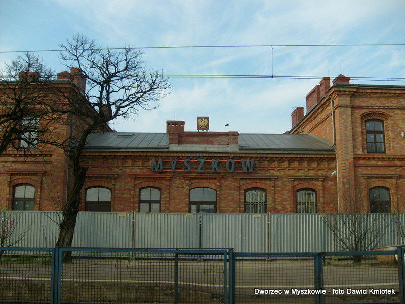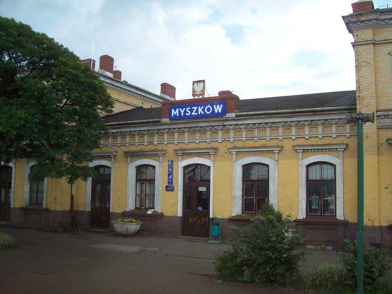 Zdjęcie przedstawia czołową część budynku. Widzimy wyraźny napis nazwy stacji: MYSZKÓW.