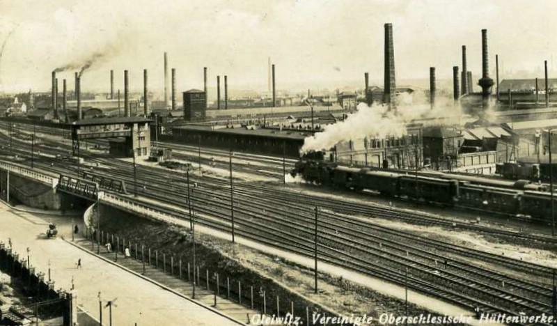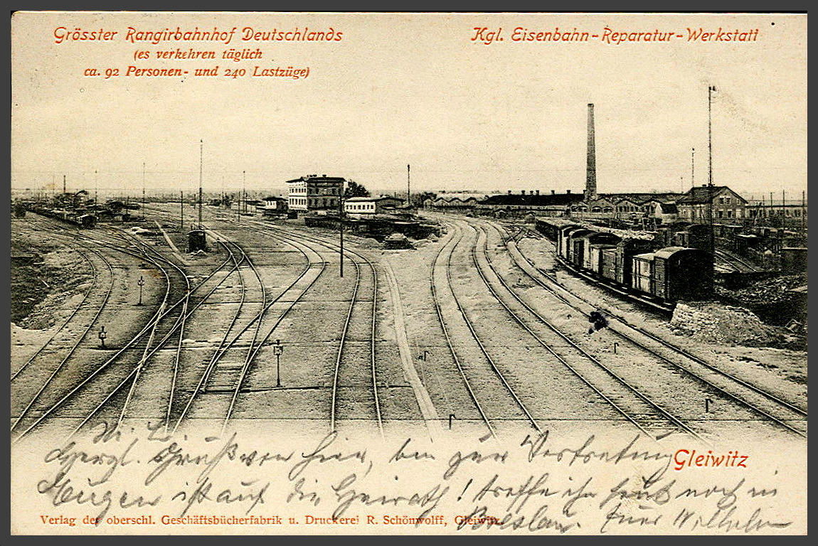 Stara pocztówka. Podpis w lewym-górnym rogu: Gliwice jedna z największych stacji rozrządowych w Niemczech, codziennie obsługuje 92 pociągów osobowych i 240 towarowych. Podpis w prawym-górnym rogu: Królewskie Zakłady Naprawcze Taboru Kolejowego.