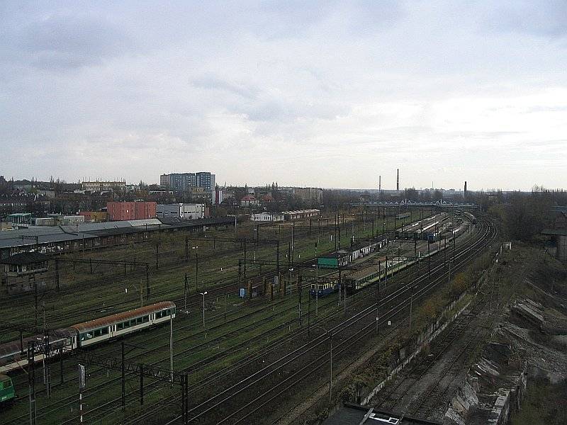 Widok z wieży Huty Gliwice w stronę Katowic i Bytomia. Widoczne tory grupy postojowej, z lewej strony zdjęcia zobaczymy też zdemolowaną nastawnię. Teren pomiędzy istniejącymi torami, a widoczną rampą zajmowała niegdyś stacja towarowa - obecnie same krzaki, tory zostały rozebrane.