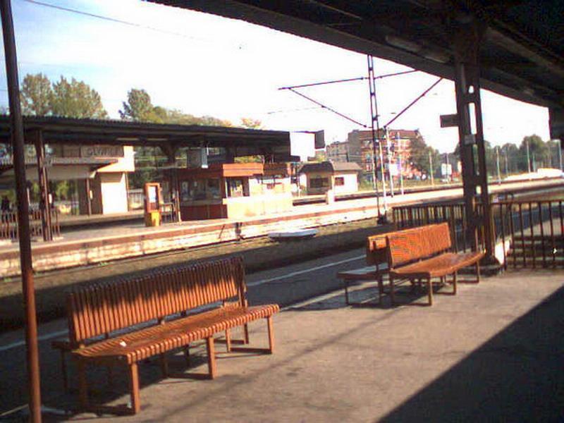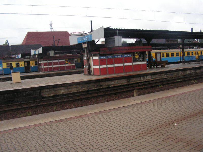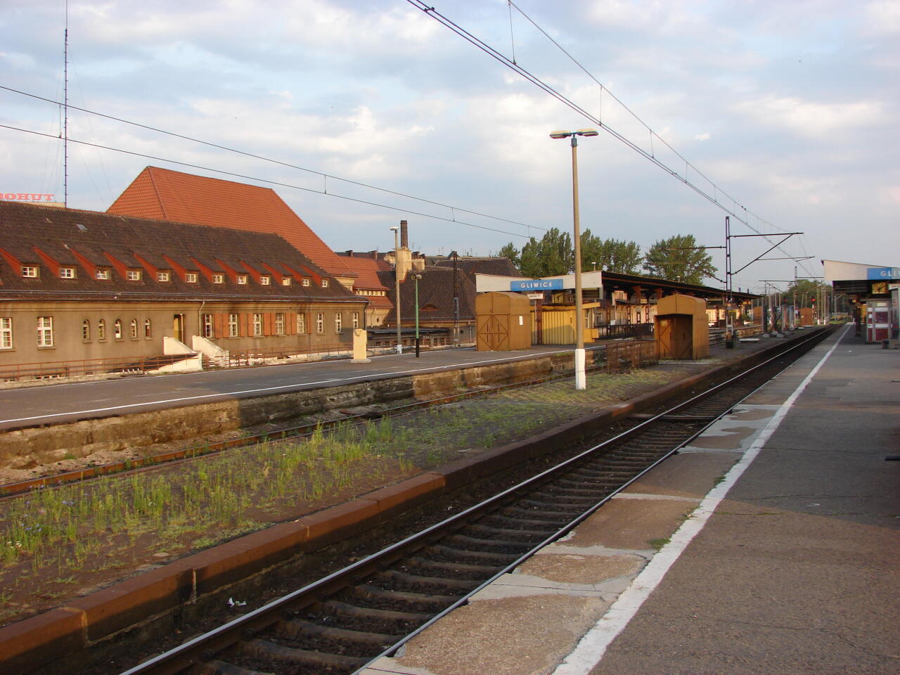 Widok z peronu 2 na peron 1. Po lewej budynek dworca. Kierunek północno-zachodni (Gliwice Łabędy, dalej Opole i Kędzierzyn-Koźle).