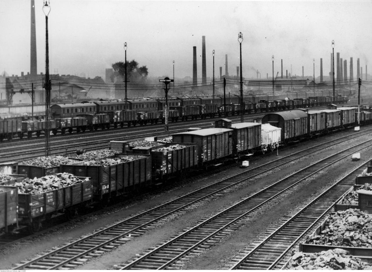 "Pociągi wypełnione węglem kamiennym na stacji kolejowej na Górnym Śląsku przed odjazdem do Rzeszy".
