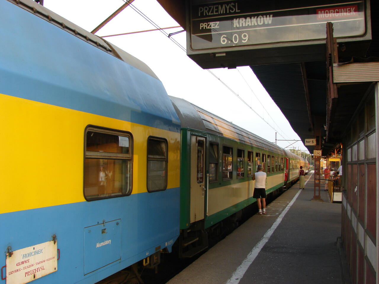 W peronie stoi pociąg pośpieszny MORCINEK rel. Gliwice-Przemyśl.