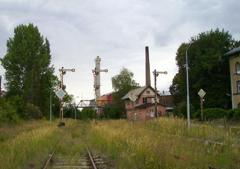 Kształtowa tarcza manewrowa i kładka nad torami. Po prawej fragment nastawni dysponujące Bw. W tle Cukrownia Baborów. Widok w kierunku północno-zachodnim; Głubczyce, Polska Cerekiew (dawniej dalej, do Kędzierzyna-Koźla).