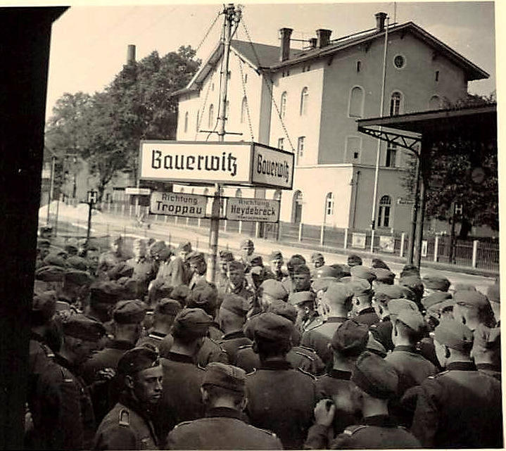 Żołnierze na peronie 2, w tle fragment peronu 1 i budynek dworca. Napis na peronie: kierunek Opawa (Troppau) i Kędzierzyn-Koźle (Heydebreck). Widok w kierunku północnym, od strony wjazdów z Pietrowic Wielkich/Raciborza i Opawy.