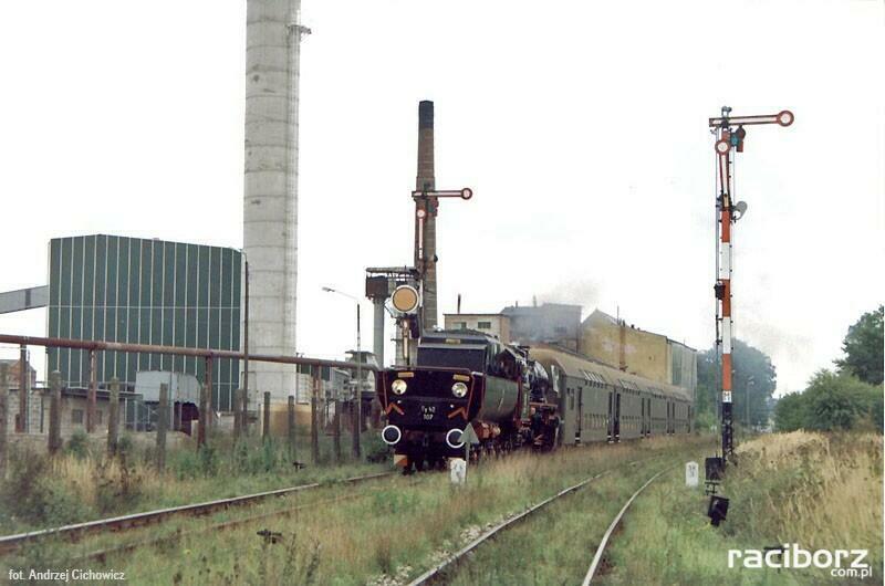 Po lewej (peron 2) pociąg specjalny do Pilszcza (stonka w miejsce zdefektowanego Ty42), a po prawej (peron 1) planowy z Racławic Śl. do Raciborza. Widok w kierunku północno-zachodnim, od strony wjazdów z Pietrowic Wielkich/Raciborza i Pilszcza (dawniej z Opawy).