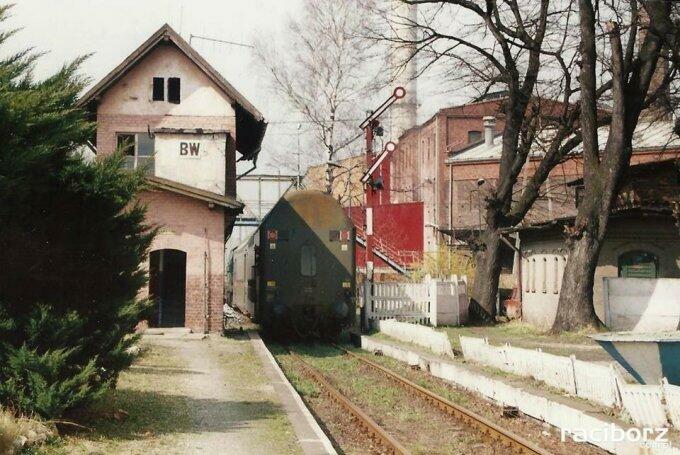 Ostatni pociąg pasażerski do Racławic Śląskich opuszcza peron 1. Z lewej nastawnia dysponująca. Z prawej (poza kadrem) budynek dworca. W tle Cukrownia Baborów. Widok w kierunku północno-zachodnim; Głubczyce, Polska Cerekiew (dawniej dalej, do Kędzierzyna-Koźla).