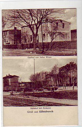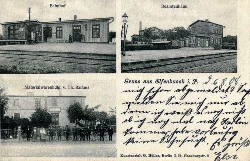 Stara pocztówka. Budynek dworca (pole górne, lewe) i kolejowy budynek mieszkalny (pole górne, prawe).