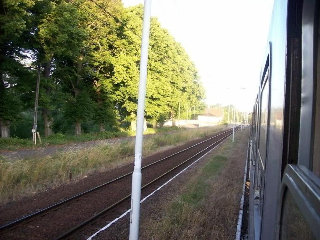 Stacja Iwin. Pociąg TLK relacji Kołobrzeg - Przemyśl Główny po postoju odjeżdża ze stacji Iwin. Widok z pociągu.