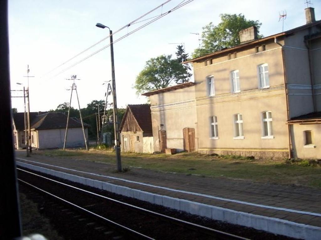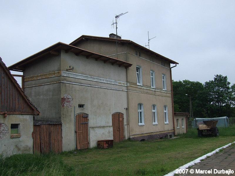 Budynki stacyjne od strony torów. Od lewej: magazyn towarowy i dworzec z nastawnią dysponującą. Widok w kierunku Szczecinka.