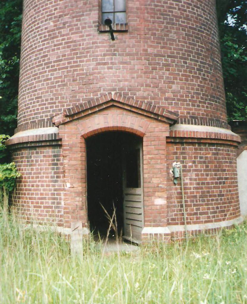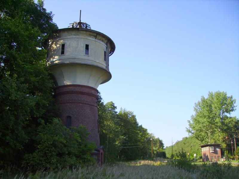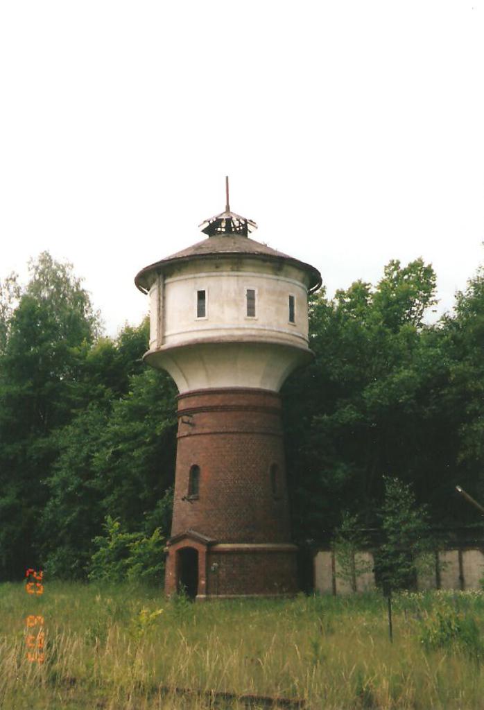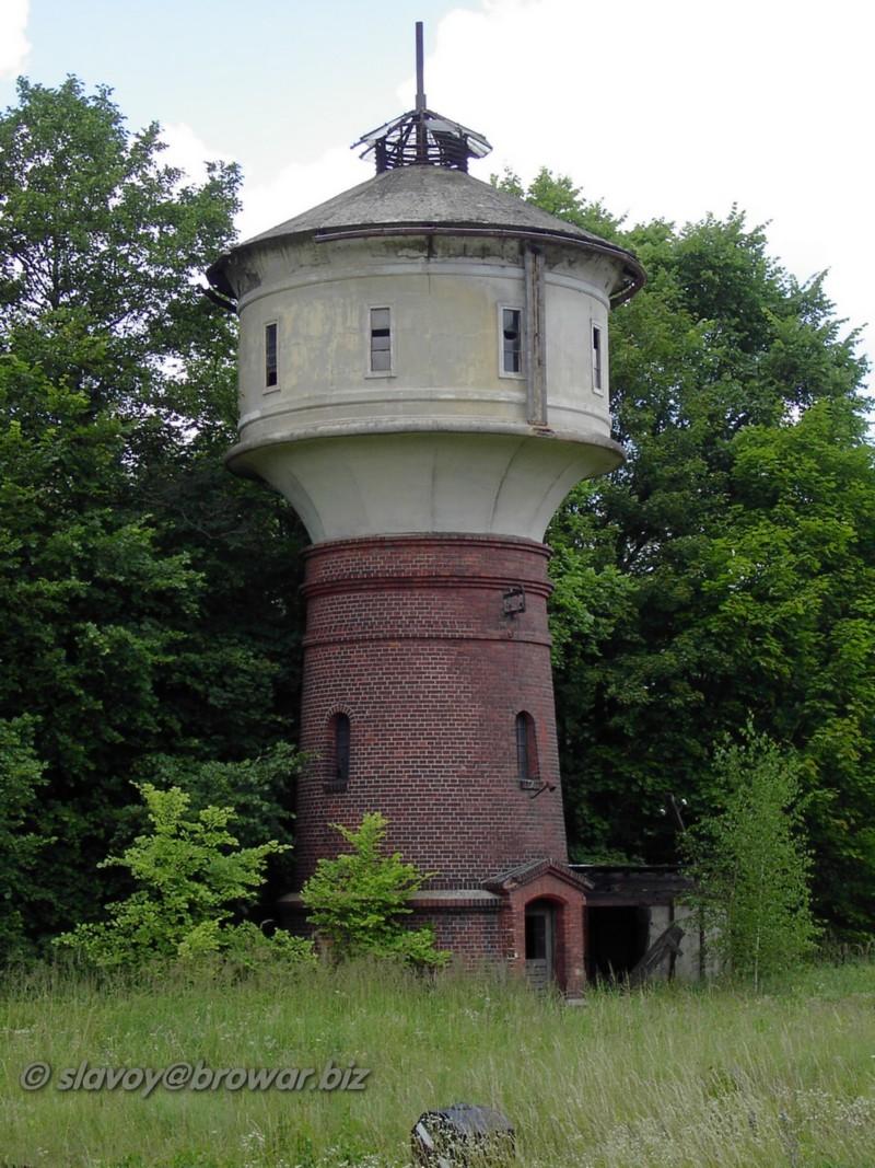 Wieża wodna. W tle, po prawej nieczynna nastawnia wykonawcza. Widok w kierunku północnym.