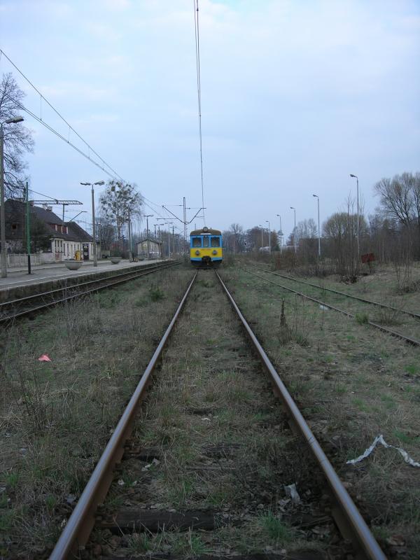 Budynek dworca od strony torów jeszcze nie jest odmalowany. Widoczne tory w kierunku Tarnowskie Góry.