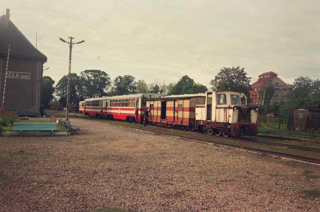 Stacja Ełk Wąskotorowy - budynek stacyjny, pociąg OS 1854 relacji Sypitki - Ełk Wąskotorowy, prowadzony lokomotywą Lyd1-214 skończył bieg. Widok w kierunku stacji Turowo.