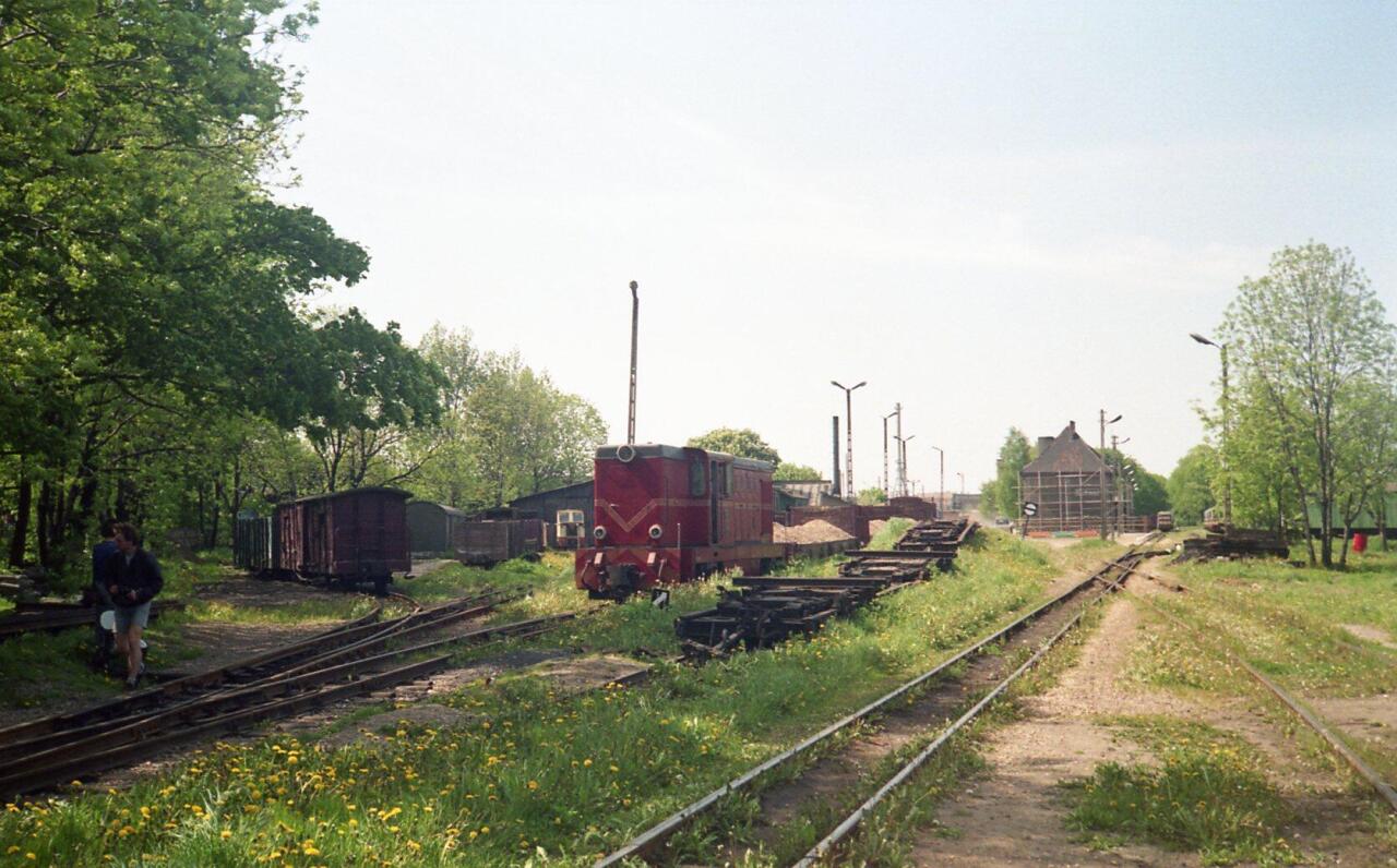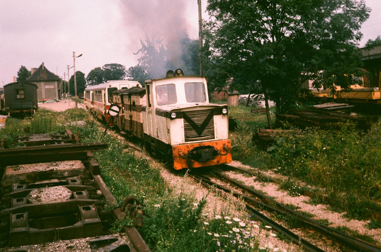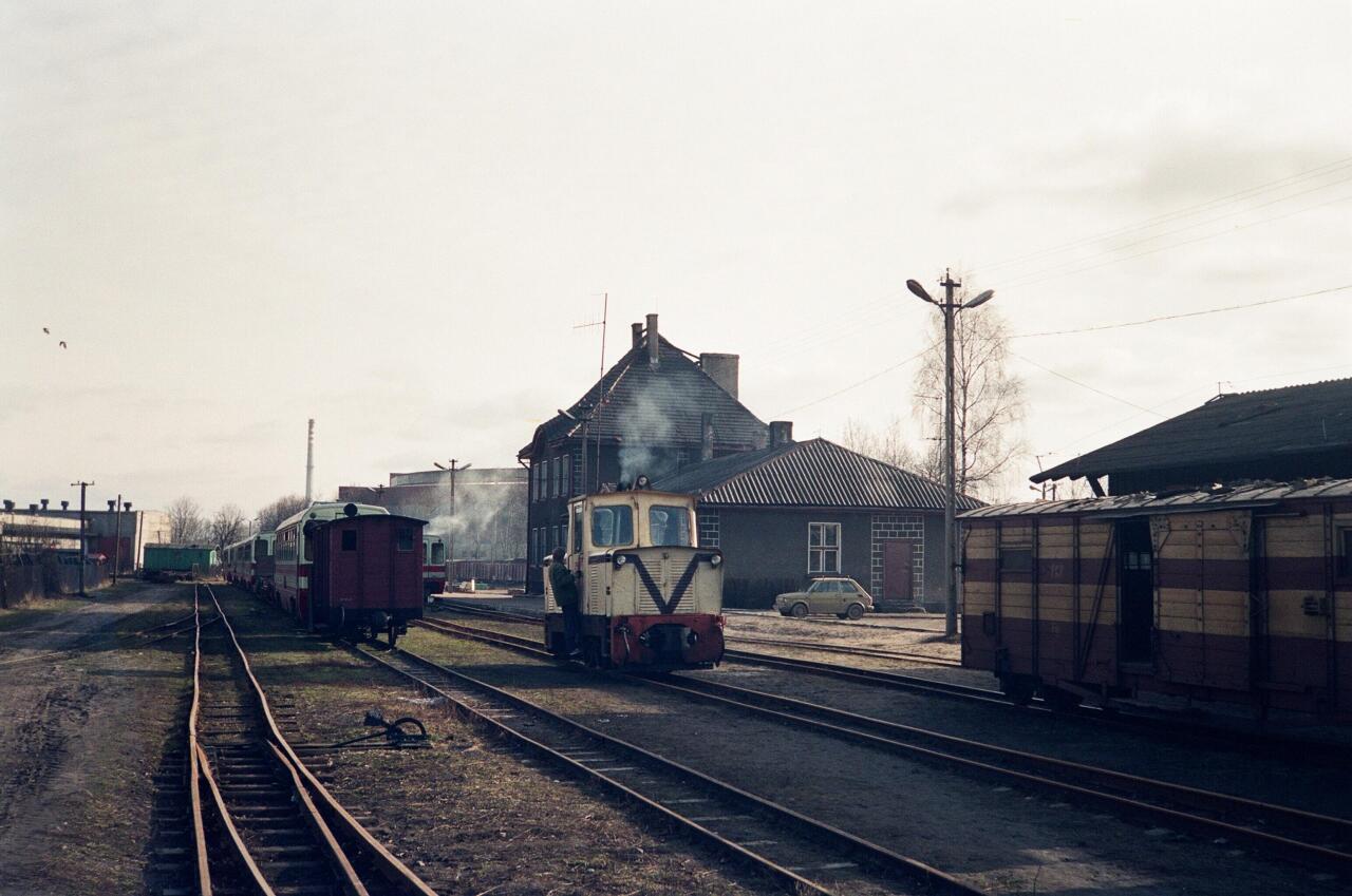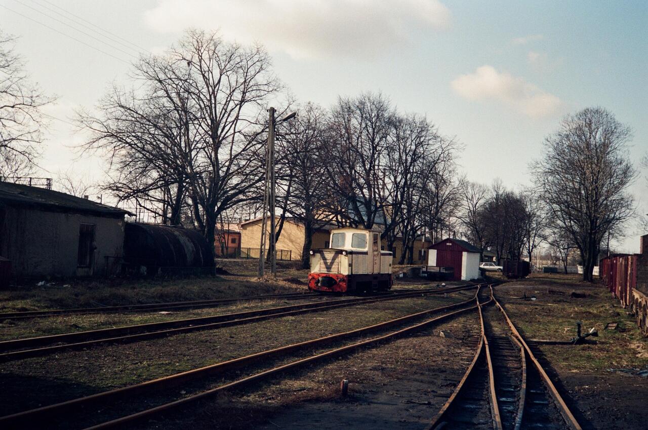 Stacja Ełk Wąskotorowy - lokomotywa Lxd2-247 w trakcie manewrów stacyjnych (zestawianie pociągu roboczego). Widoczna rampa czołowa do załadunku i wyładunku taboru wąskotorowego.