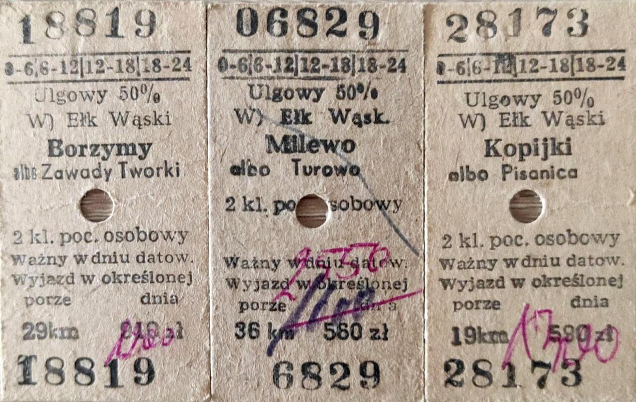 Bilety kartonowe wydane w kasie biletowej stacji Ełk Wąskotorowy w 1991 roku.