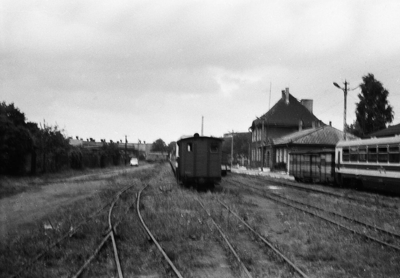 Stacja Ełk Wąskotorowy - tory postojowe, budynek stacyjny - widok w kierunku stacji Turowo.
